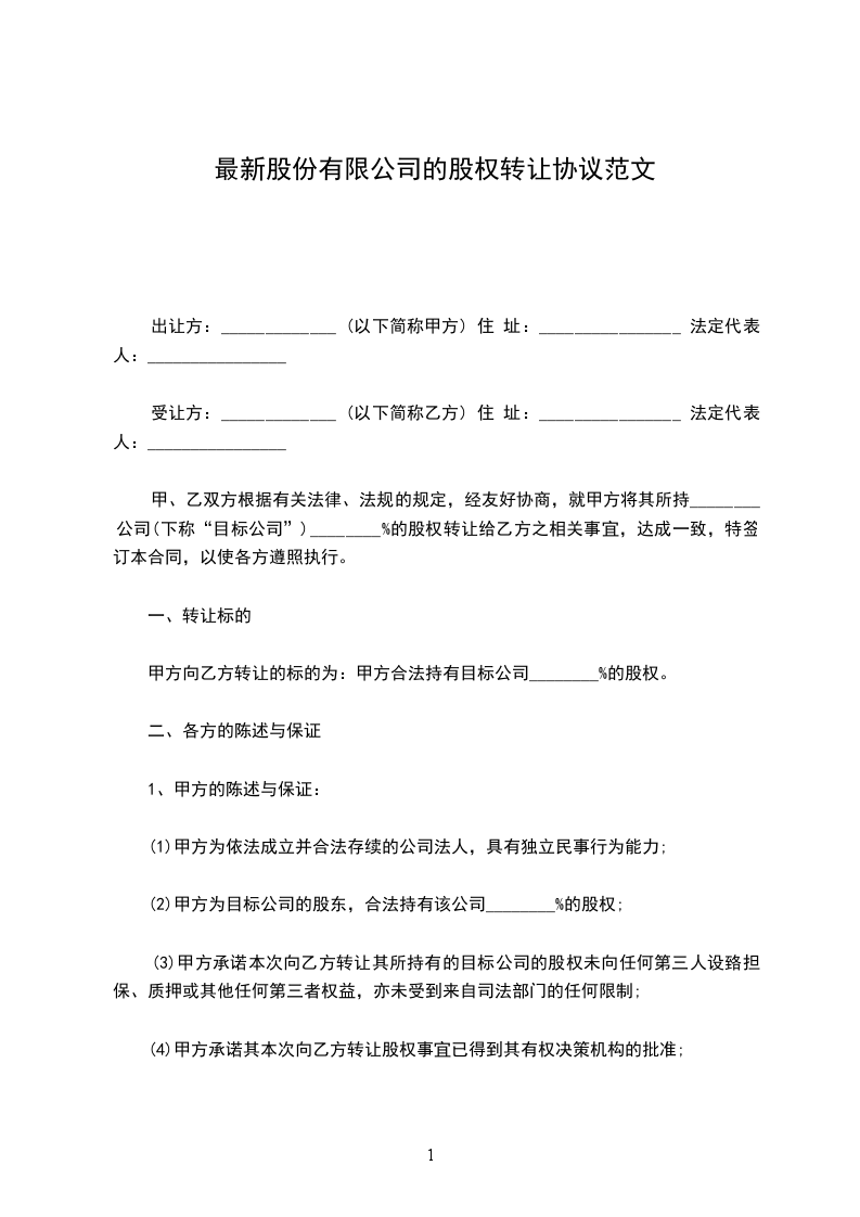甲、乙双方根据有关法律、法规的规定,经友好协商,就甲方将其所持________公司(下称“目标公司”)________%的股权转让给乙方之相关事宜,达成一致,特签订本合同,以使各方遵照执行。