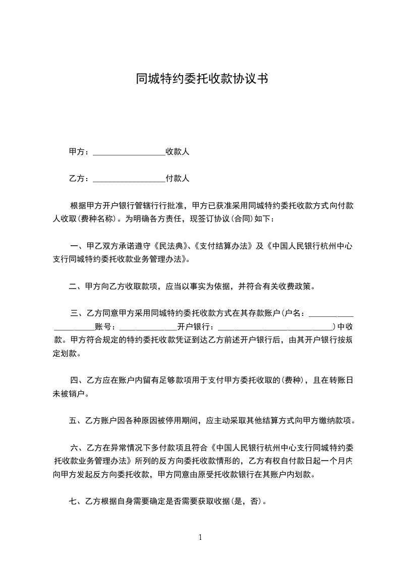 根据甲方开户银行管辖行行批准,甲方已获准采用同城特约委托收款方式向付款人收取(费种名称)。为明确各方责任,现签订协议(合同)如下: