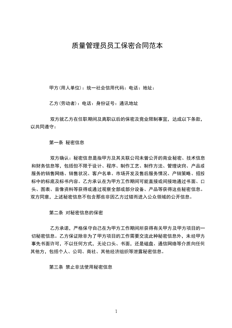 根据国家有关部门推荐使用《员工保密合同》,结合本公司实际,鉴于甲方在乙方任职,并将获得乙方支付的相应报酬,双方就甲方在乙方任职期间及离职以后保守乙方技术秘密和其他商业秘密的有关事项,订定下列条款共同遵守: