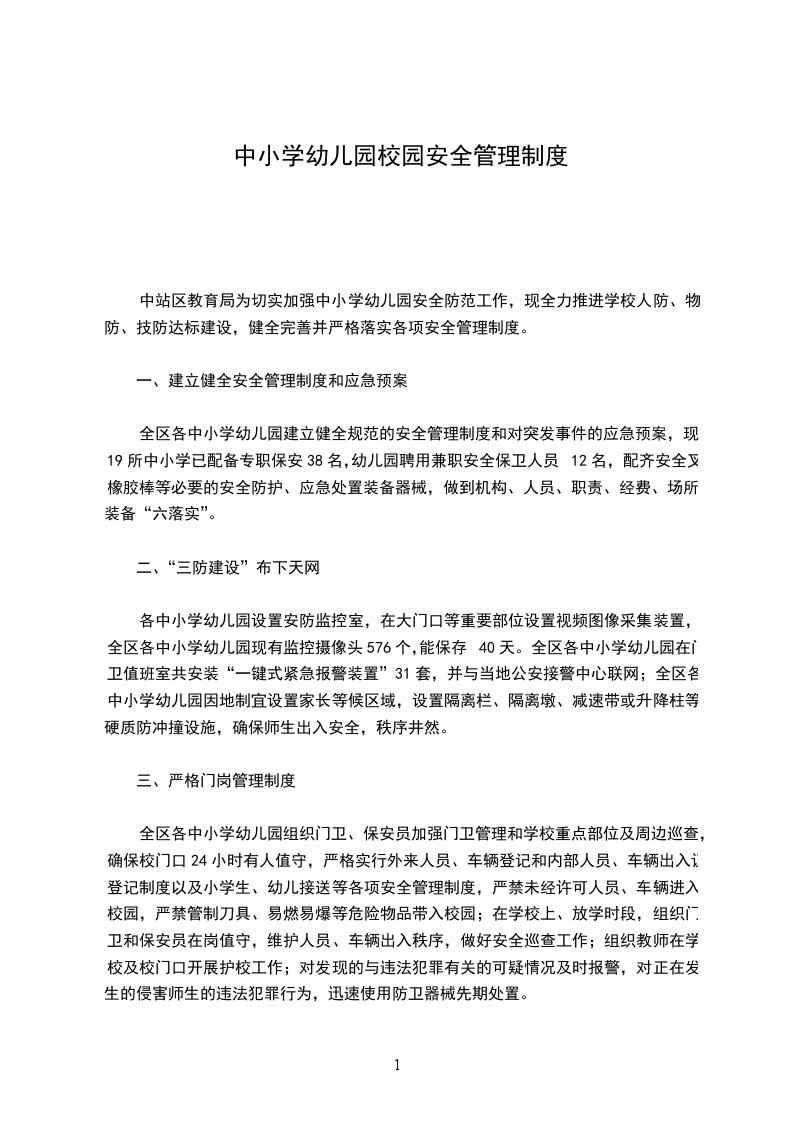 全区各中小学幼儿园建立健全规范的安全管理制度和对突发事件的应急预案,现19所中小学已配备专职保安38名,幼儿园聘用兼职安全保卫人员12名,配齐安全叉、橡胶棒等必要的安全防护、应急处置装备器械,做到机构、人员、职责、经费、场所、装备“六落实”。