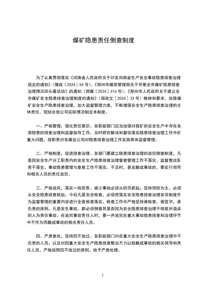 为了认真贯彻落实《河南省人民政府关于印发河南省生产安全事故隐患排查治理规定的通知》(豫政〔2024〕54号)、《郑州市煤炭管理局关于开展全市煤矿隐患排查治理情况回头看活动》的通知(郑煤〔2024〕216号)、《郑州市人民政府关于建立全市煤矿安全隐患排查治理制度的通知》(郑政文〔2024〕33号)精神和要求,加强煤矿安全生产隐患排查治理,加大监督管理力度,不断增强安全生产隐患排查治理的主体责任,现结合我公司实际情况制定本制度。
