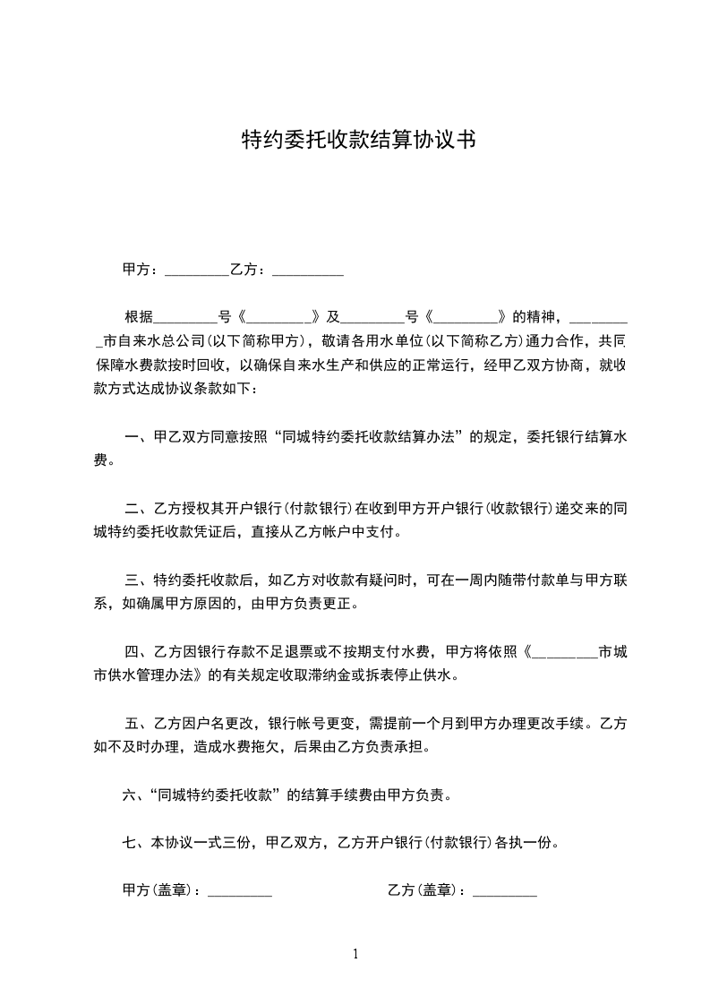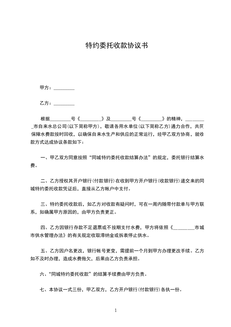 根据_________号《_________》及_________号《_________》的精神,_________市自来水总公司(以下简称甲方),敬请各用水单位(以下简称乙方)通力合作,共同保障水费款按时回收,以确保自来水生产和供应的正常运行,经甲乙双方协商,就收款方式达成协议条款如下: