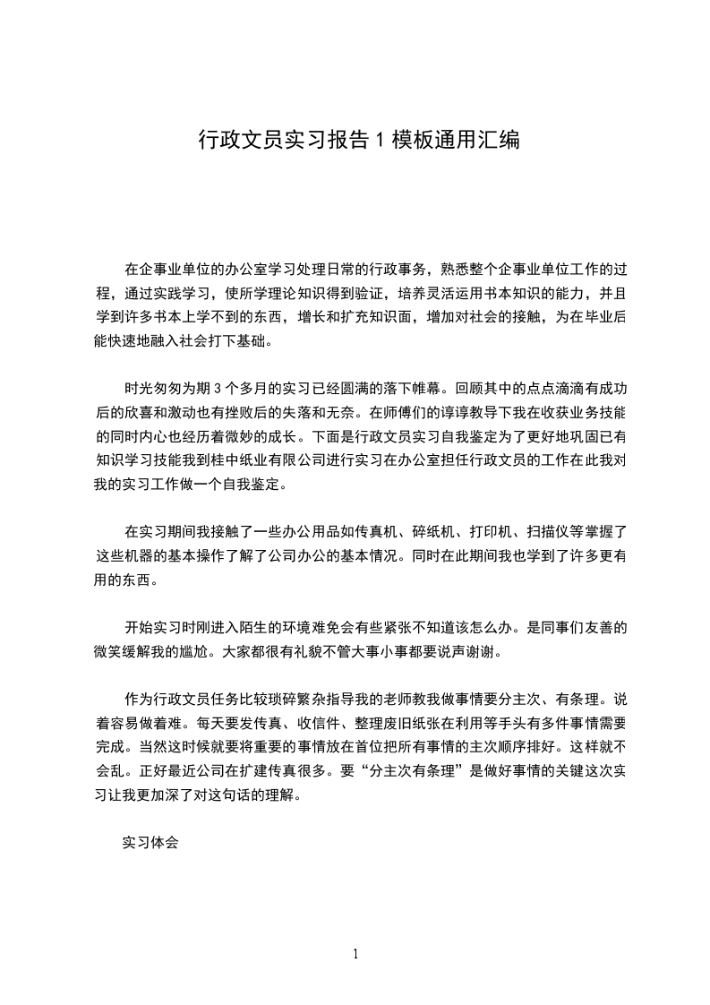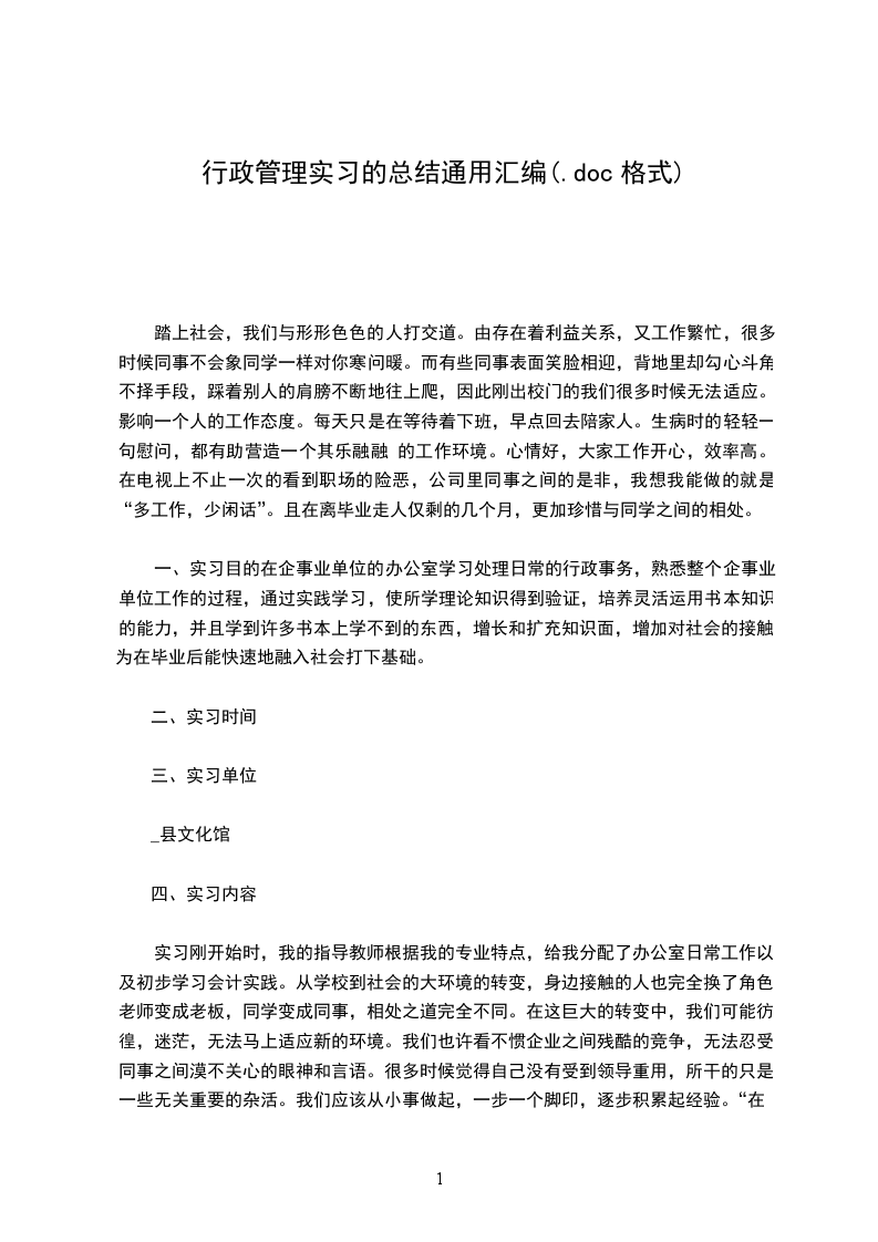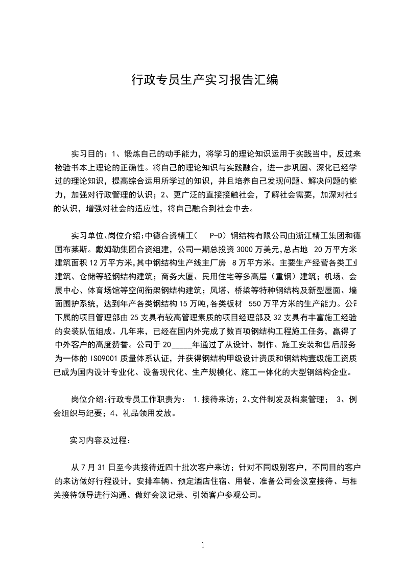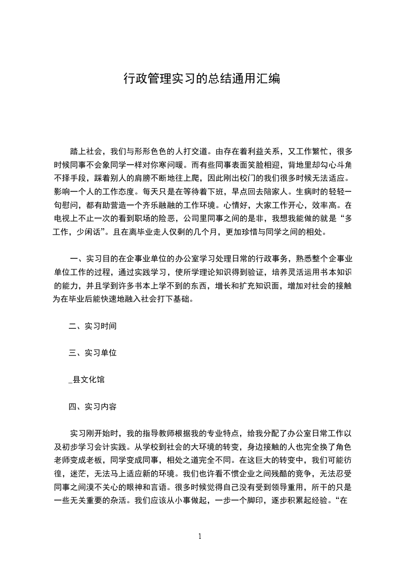 一、实习目的在企事业单位的办公室学习处理日常的行政事务,熟悉整个企事业单位工作的过程,通过实践学习,使所学理论知识得到验证,培养灵活运用书本知识的能力,并且学到许多书本上学不到的东西,增长和扩充知识面,增加对社会的接触,为在毕业后能快速地融入社会打下基础。