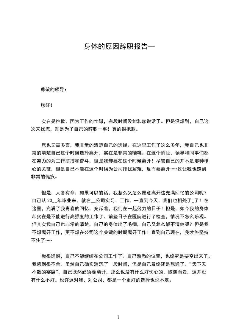 但是,人各有命,如果可以的话,我怎么又怎么愿意离开这充满回忆的公司呢?自己从20__年毕业来,就在__公司实习、工作,一直到今天,我们也相处了_了!在这里,充满了我青春的回忆,充斥着,我们在一起努力的日子!但是,如今我的身体却实在是不能进行高强度的工作了。前些日子在医院进行了检查,情况不怎么乐观。但其实我自己也非常的清楚,自己的身体出了毛病,自己又怎么能不清楚呢?但是我不想离开工作,更不想在公司这个关键的时期离开工作!直到自己现在,我才终坚持不住了……