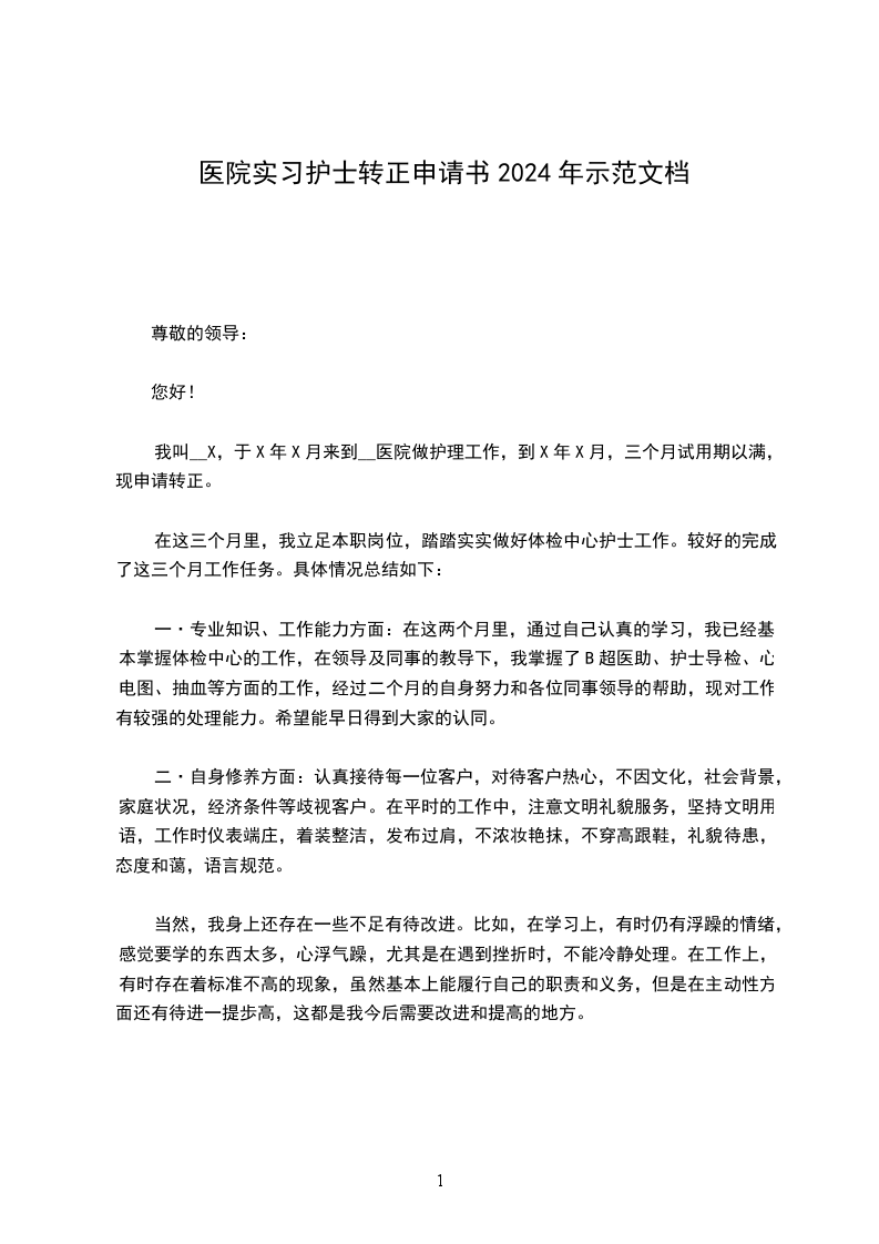 我叫__X,于X年X月来到__医院做护理工作,到X年X月,三个月试用期以满,现申请转正。