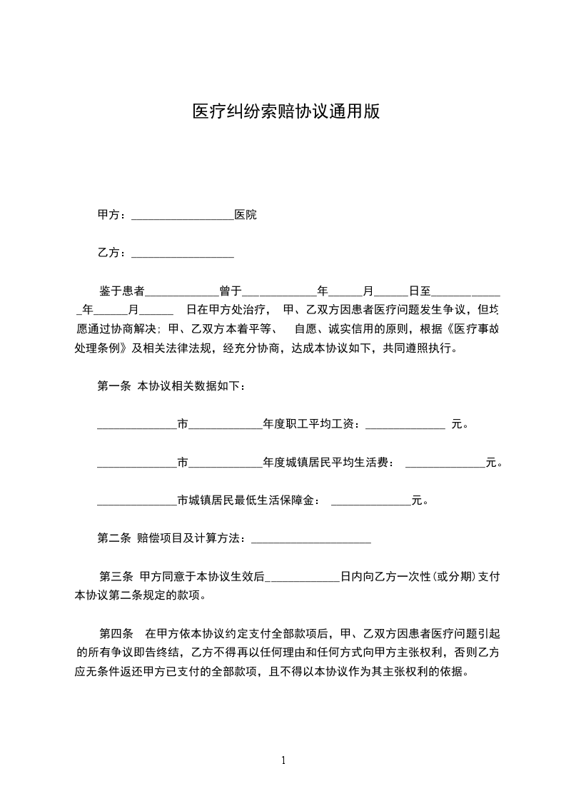 第四条 在甲方依本协议约定支付全部款项后,甲、乙双方因患者医疗问题引起的所有争议即告终结,乙方不得再以任何理由和任何方式向甲方主张权利,否则乙方应无条件返还甲方已支付的全部款项,且不得以本协议作为其主张权利的依据。