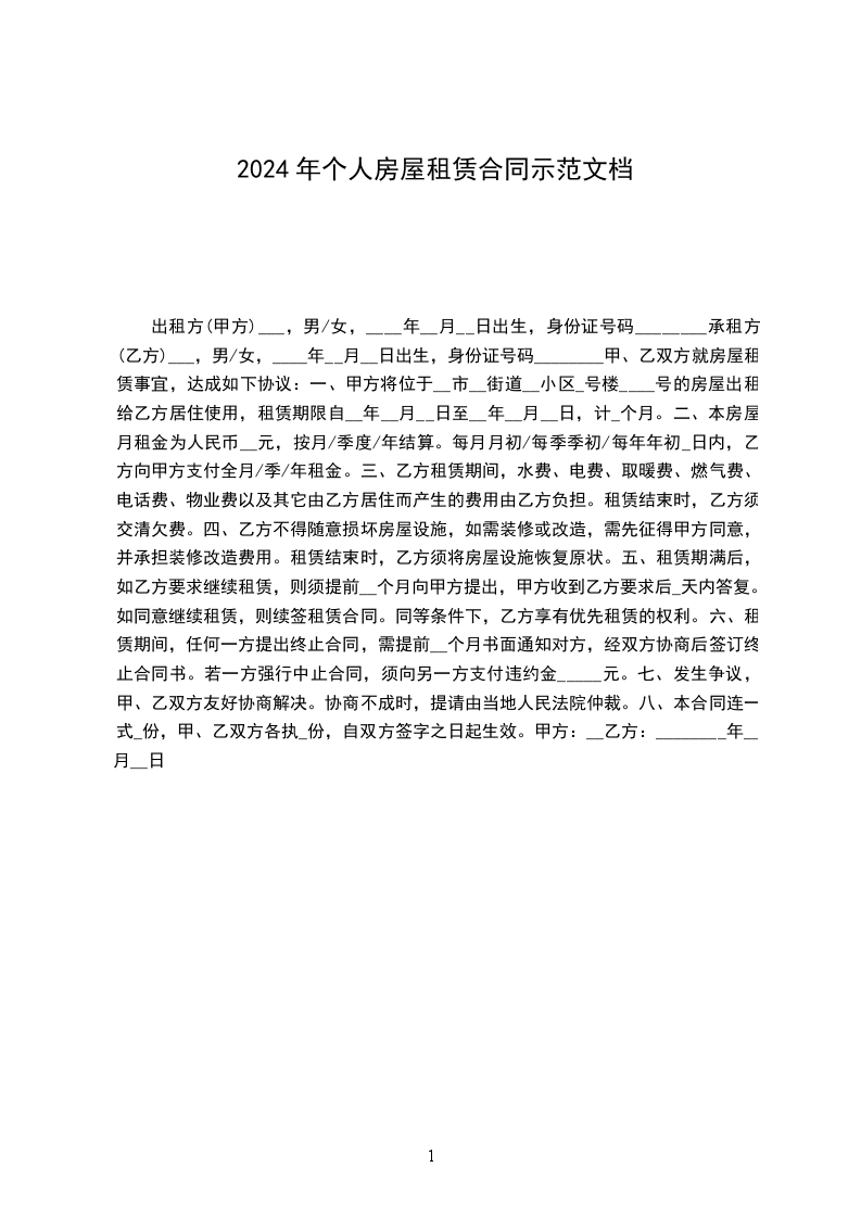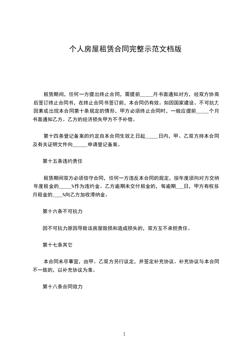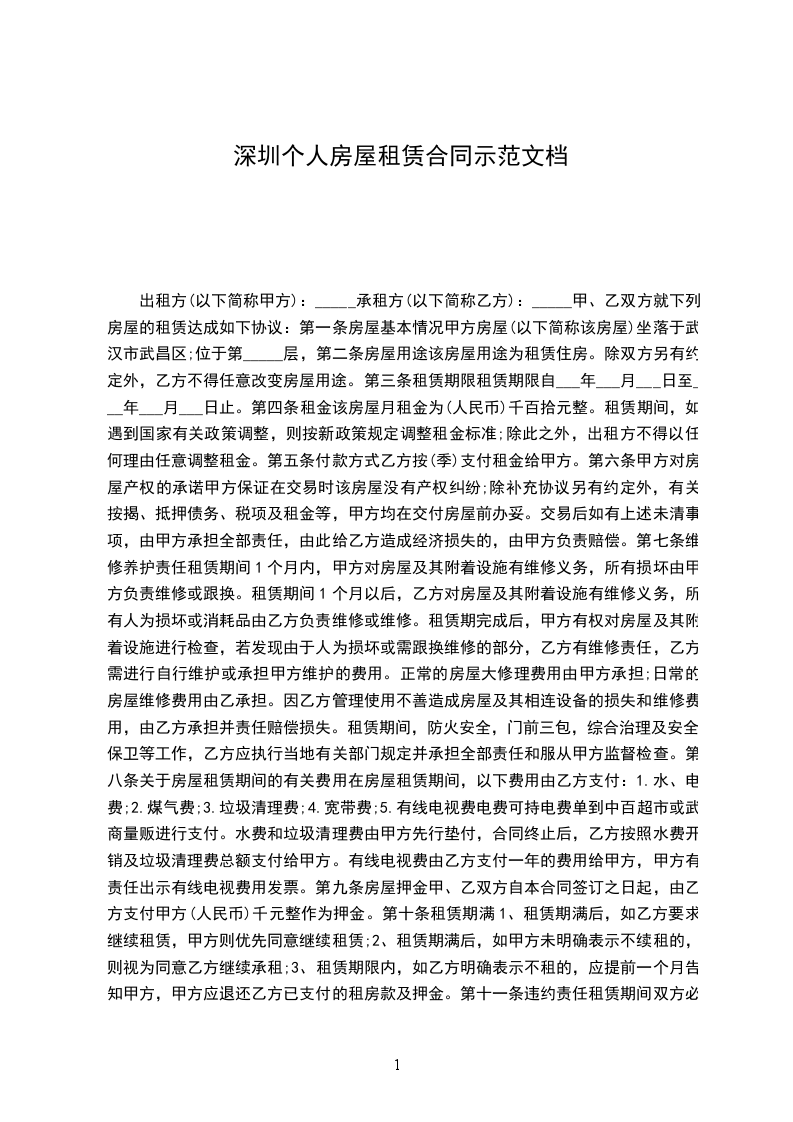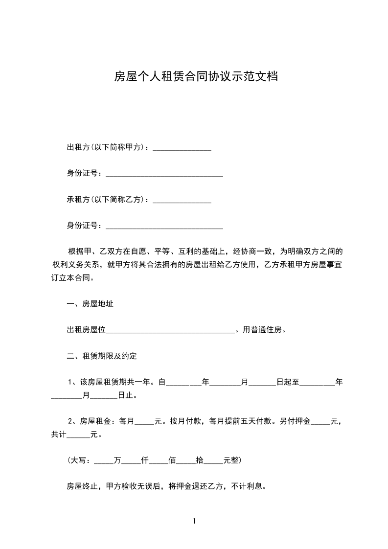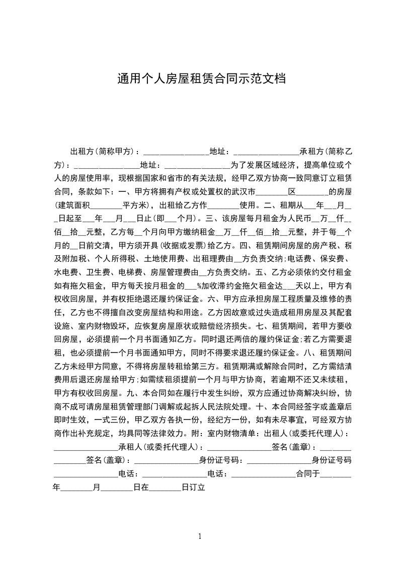 1、该房屋租赁期共一年。自_________年________月_______日起至_________年________月_______日止。