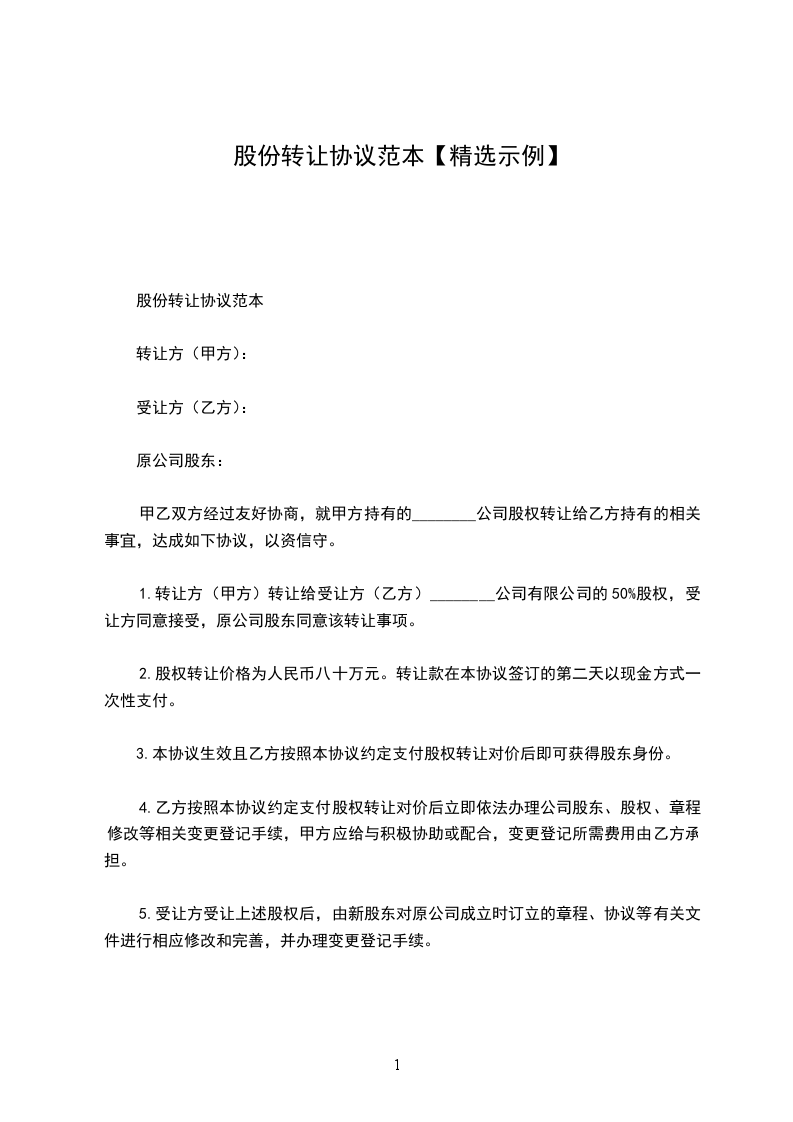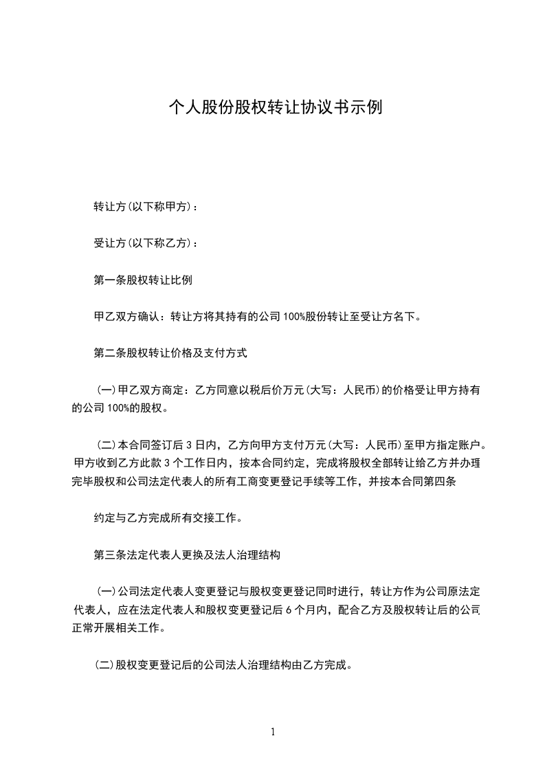 (一)甲乙双方商定:乙方同意以税后价万元(大写:人民币)的价格受让甲方持有的公司100%的股权。