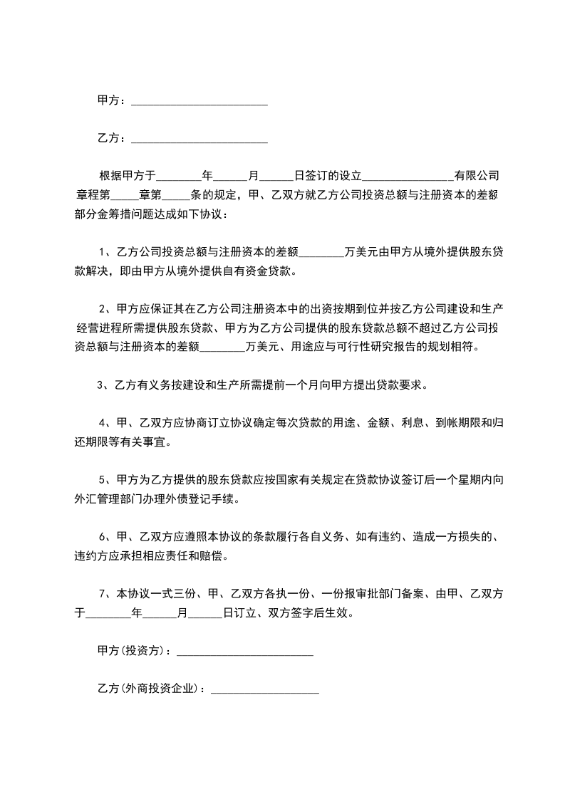 1、乙方公司投资总额与注册资本的差额________万美元由甲方从境外提供股东贷款解决,即由甲方从境外提供自有资金贷款。
