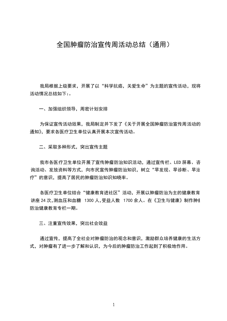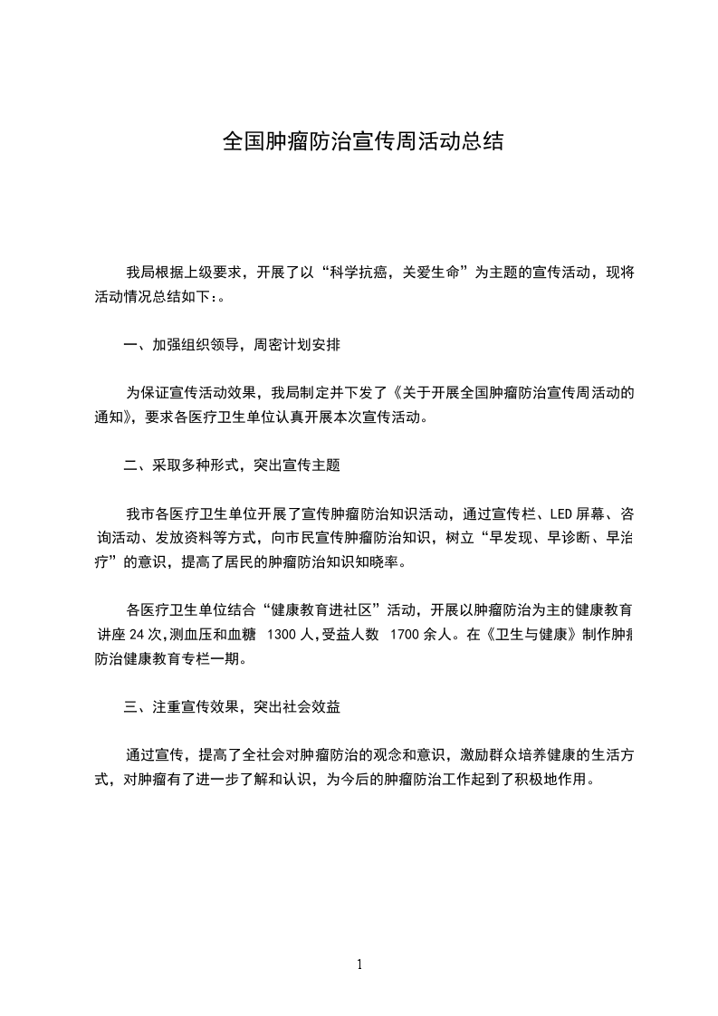 通过宣传,提高了全社会对肿瘤防治的观念和意识,激励群众培养健康的生活方式,对肿瘤有了进一步了解和认识,为今后的肿瘤防治工作起到了积极地作用。