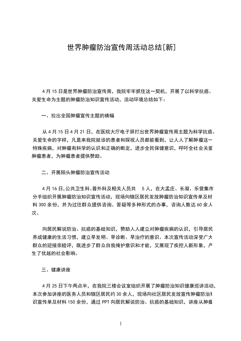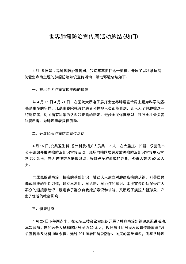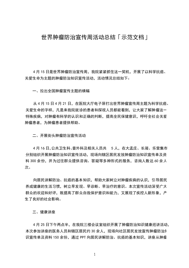 我局根据上级要求,开展了以“科学抗癌,关爱生命”为主题的宣传活动,现将活动情况总结如下:。
