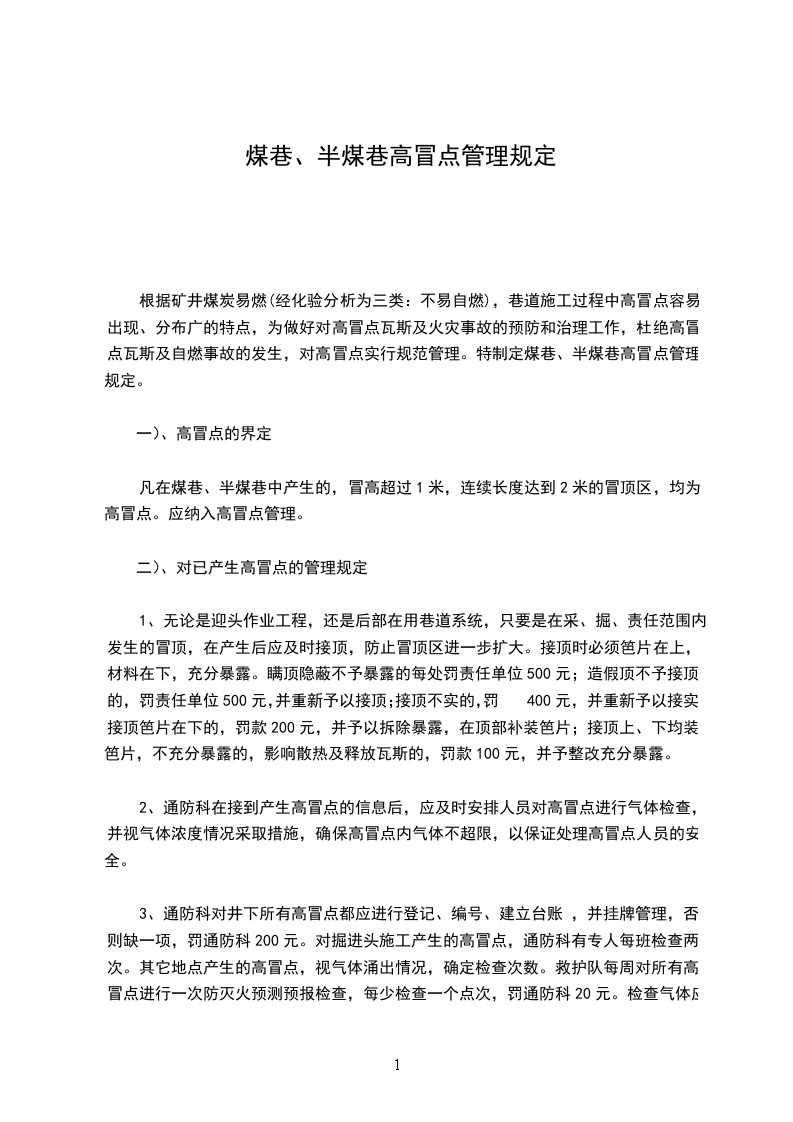 根据矿井煤炭易燃(经化验分析为三类:不易自燃),巷道施工过程中高冒点容易出现、分布广的特点,为做好对高冒点瓦斯及火灾事故的预防和治理工作,杜绝高冒点瓦斯及自燃事故的发生,对高冒点实行规范管理。特制定煤巷、半煤巷高冒点管理规定。