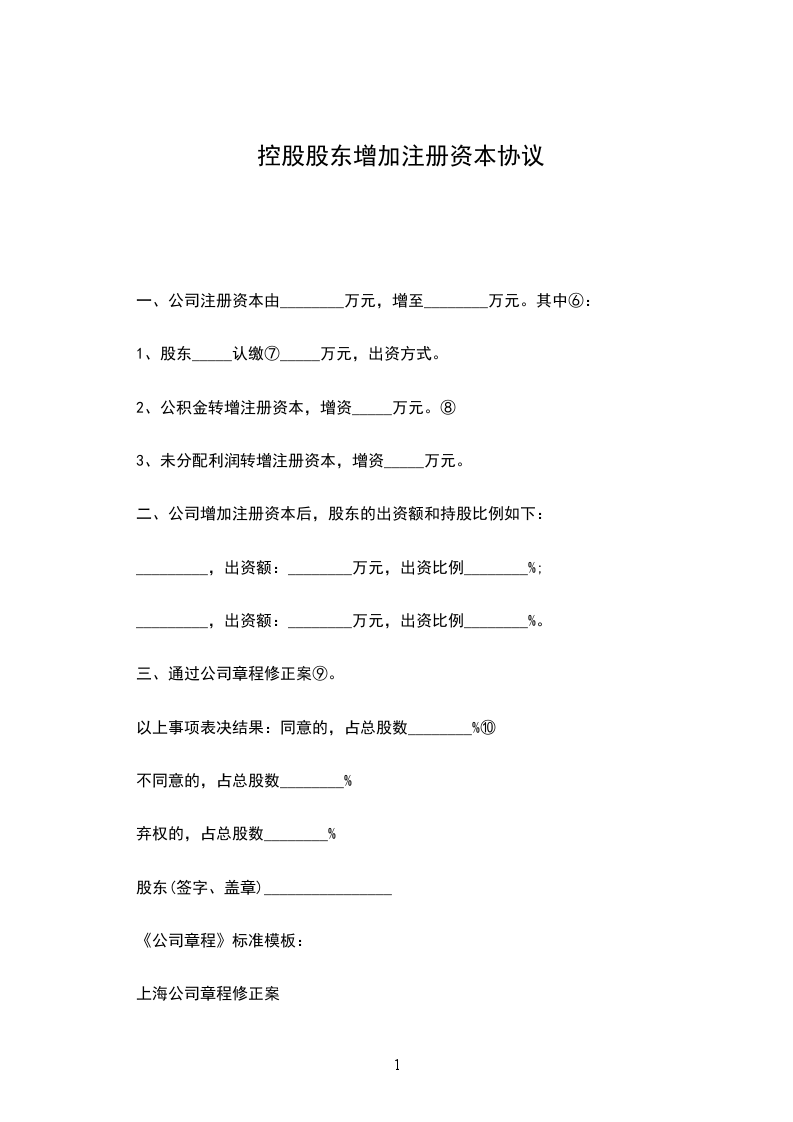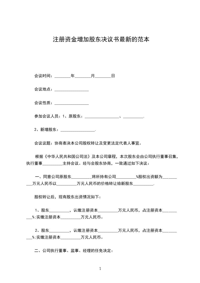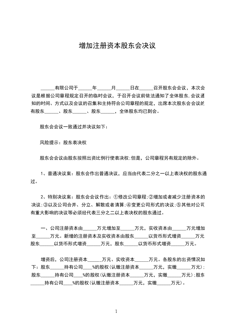 一、公司注册资本由______万元增加至______万元,实收资本由______万元增加至______万元。新增的注册资本及实收资本由股东______以货币形式增资______万元,股东______以货币形式增资______万元,股东______以货币形式增资______万元。