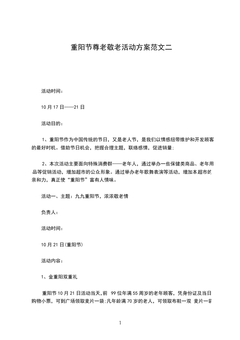 2、本次活动主要面向特殊消费群——老年人,通过举办一些保健类商品、老年用品等促销活动,增加超市的公众形象。通过举办老年歌舞表演等活动,增加本超市的亲和力,真正使“重阳节”富有人情味。
