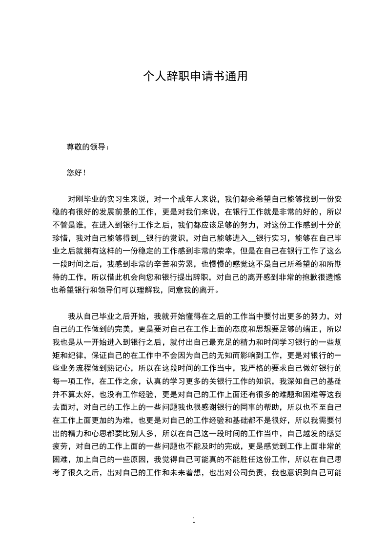 对刚毕业的实习生来说,对一个成年人来说,我们都会希望自己能够找到一份安稳的有很好的发展前景的工作,更是对我们来说,在银行工作就是非常的好的,所以不管是谁,在进入到银行工作之后,我们都应该足够的努力,对这份工作感到十分的珍惜,我对自己能够得到__银行的赏识,对自己能够进入__银行实习,能够在自己毕业之后就拥有这样的一份稳定的工作感到非常的荣幸,但是在自己在银行工作了这么一段时间之后,我感到非常的辛苦和劳累,也慢慢的感觉这不是自己所希望的和所期待的工作,所以借此机会向您和银行提出辞职,对自己的离开感到非常的抱歉很遗憾,也希望银行和领导们可以理解我,同意我的离开。