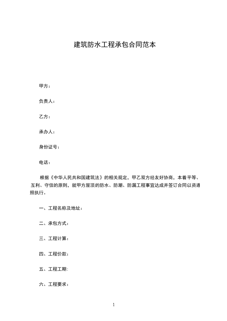 根据《中华人民共和国建筑法》的相关规定,甲乙双方经友好协商,本着平等、互利、守信的原则,就甲方屋顶的防水、防潮、防漏工程事宜达成并签订合同以资遵照执行。