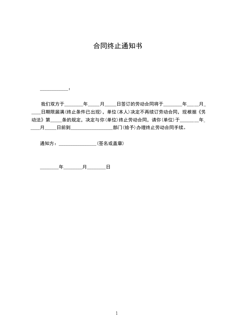 我们双方于________年_____月_____日签订的劳动合同将于________年_____月_____日期限届满(终止条件已出现),单位(本人)决定不再续订劳动合同,现根据《劳动法》第_____条的规定,决定与你(单位)终止劳动合同,请你(单位)于________年_____月_____日前到__________________部门(给予)办理终止劳动合同手续。