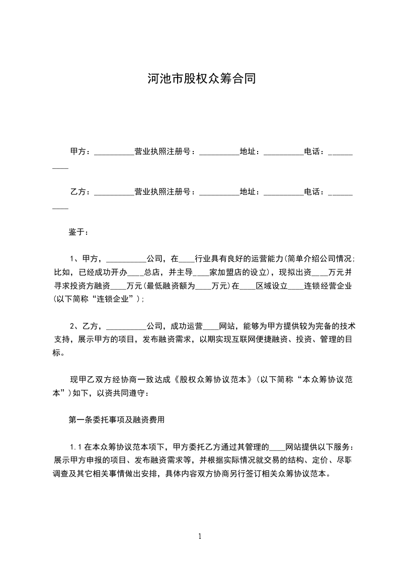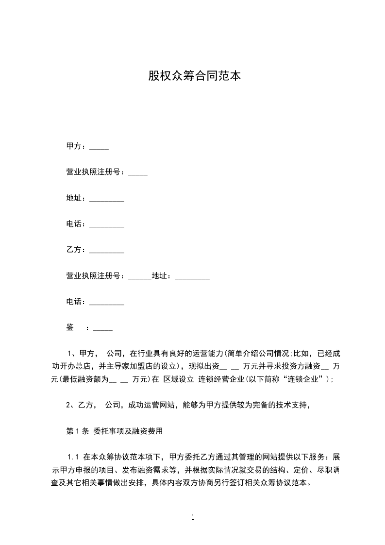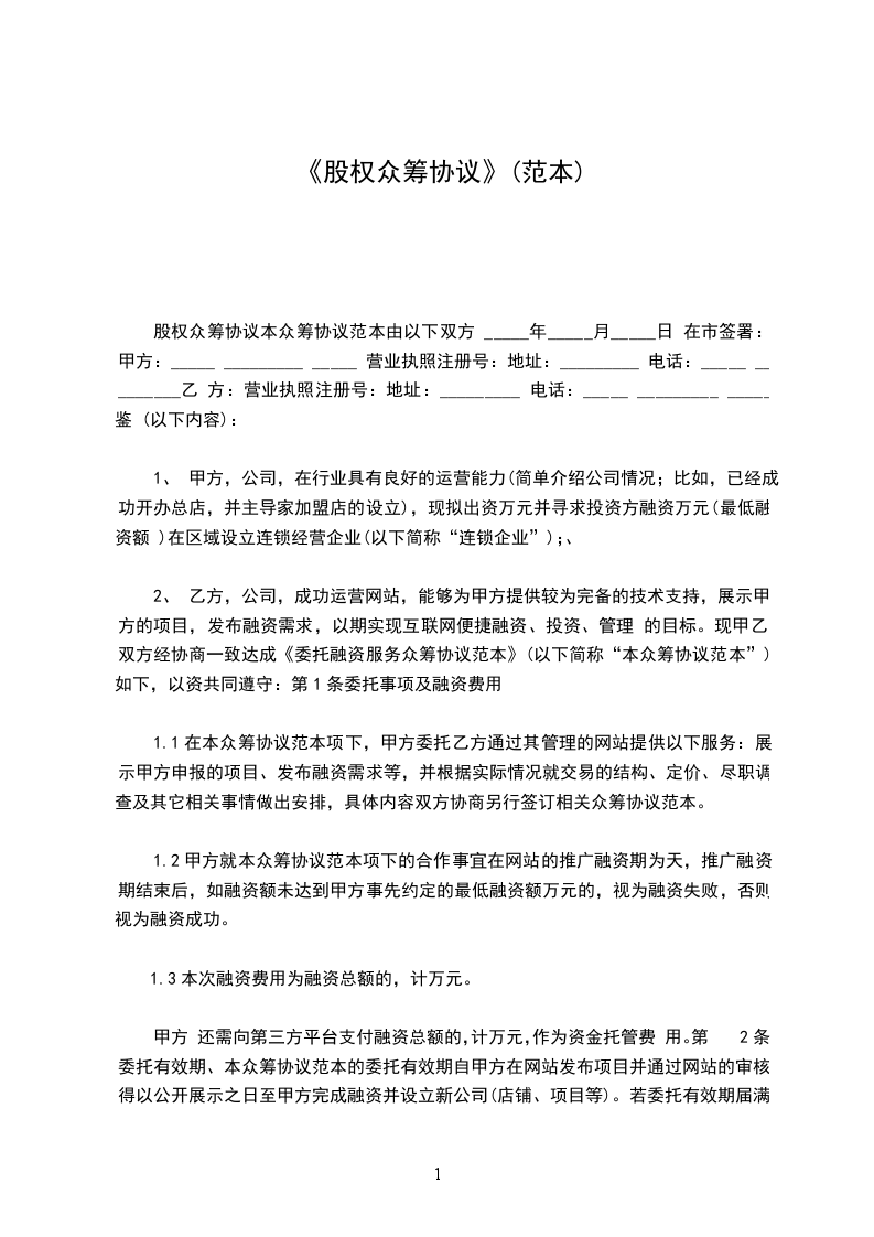 1.1在本众筹协议范本项下,甲方委托乙方通过其管理的____网站提供以下服务:展示甲方申报的项目、发布融资需求等,并根据实际情况就交易的结构、定价、尽职调查及其它相关事情做出安排,具体内容双方协商另行签订相关众筹协议范本。