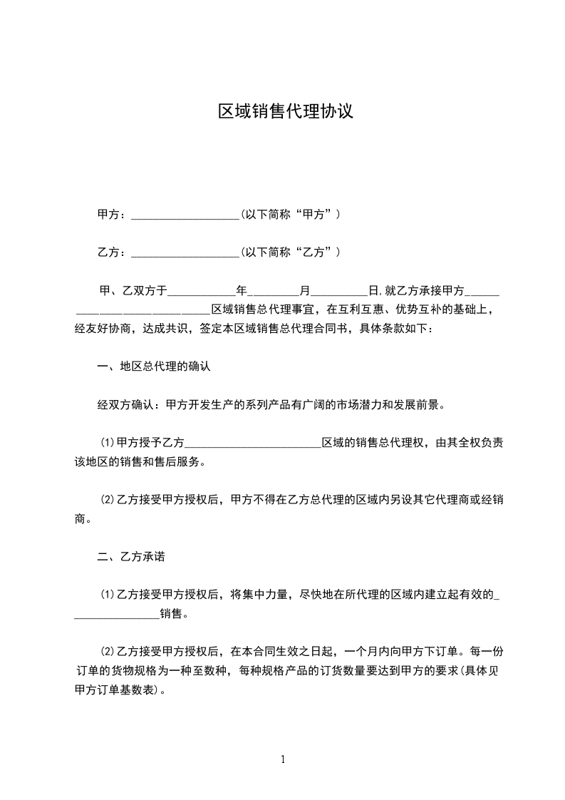 甲、乙双方于____________年_________月__________日,就乙方承接甲方_____________________________区域销售总代理事宜,在互利互惠、优势互补的基础上,经友好协商,达成共识,签定本区域销售总代理合同书,具体条款如下: