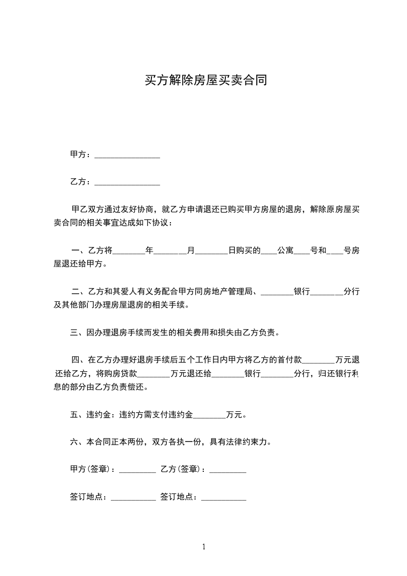 一、乙方将________年________月________日购买的____公寓____号和____号房屋退还给甲方。