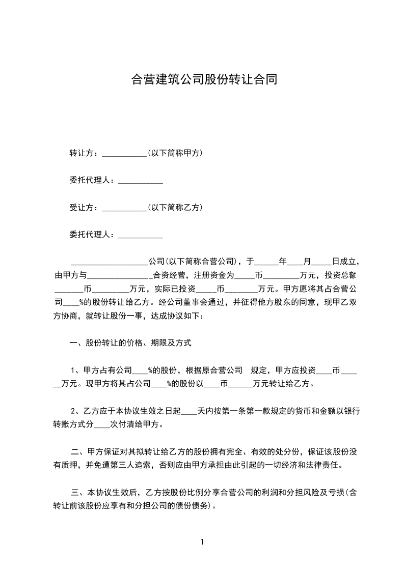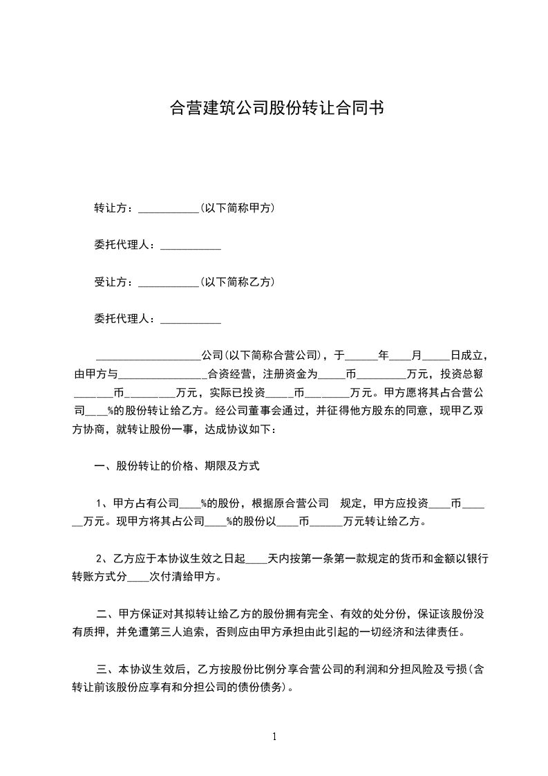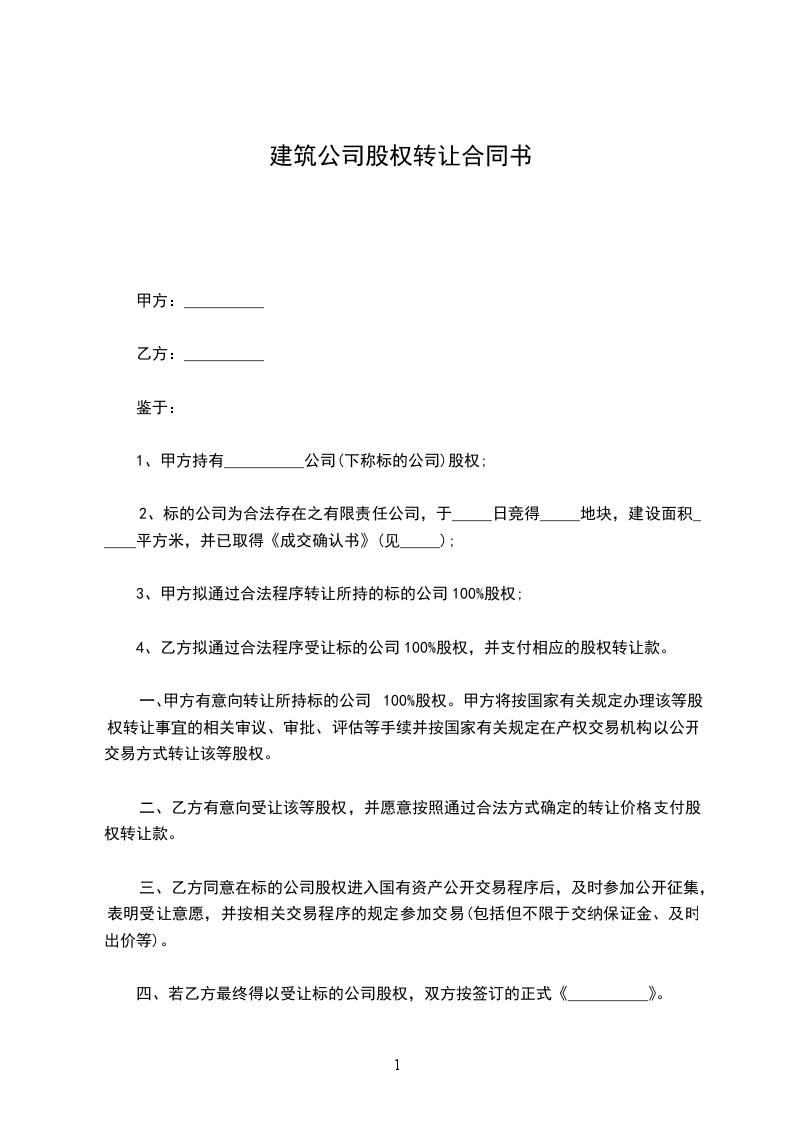 1、甲方__人作为共同转让方,将其持有的公司100%股权整体转让给乙方(受让方)__人。