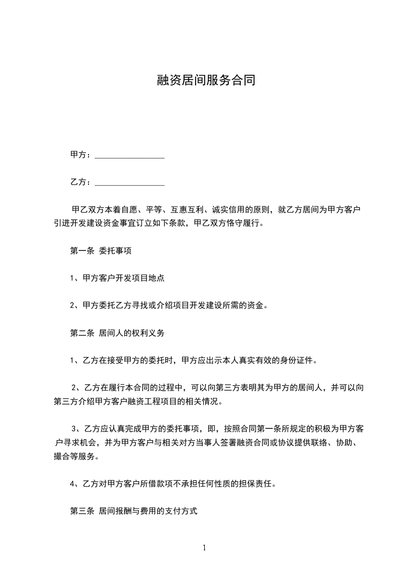 甲乙双方本着自愿、平等、互惠互利、诚实信用的原则,就乙方居间为甲方客户引进开发建设资金事宜订立如下条款,甲乙双方恪守履行。