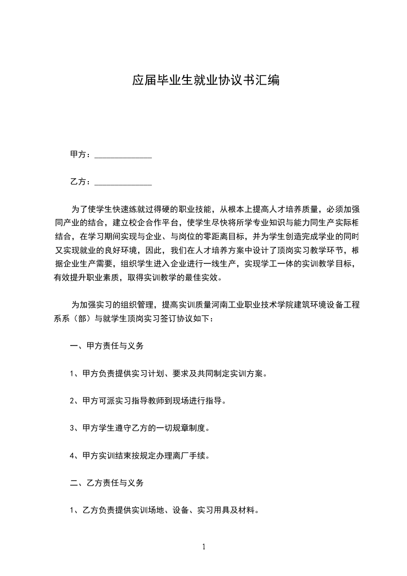 为加强实习的组织管理,提高实训质量河南工业职业技术学院建筑环境设备工程系系(部)与就学生顶岗实习签订协议如下:
