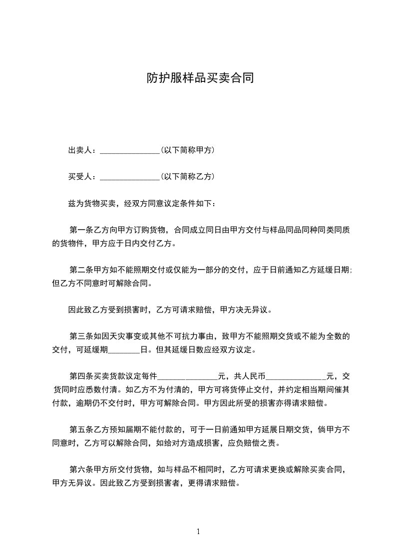 第一条乙方向甲方订购货物,合同成立同日由甲方交付与样品同品同种同类同质的货物件,甲方应于日内交付乙方。