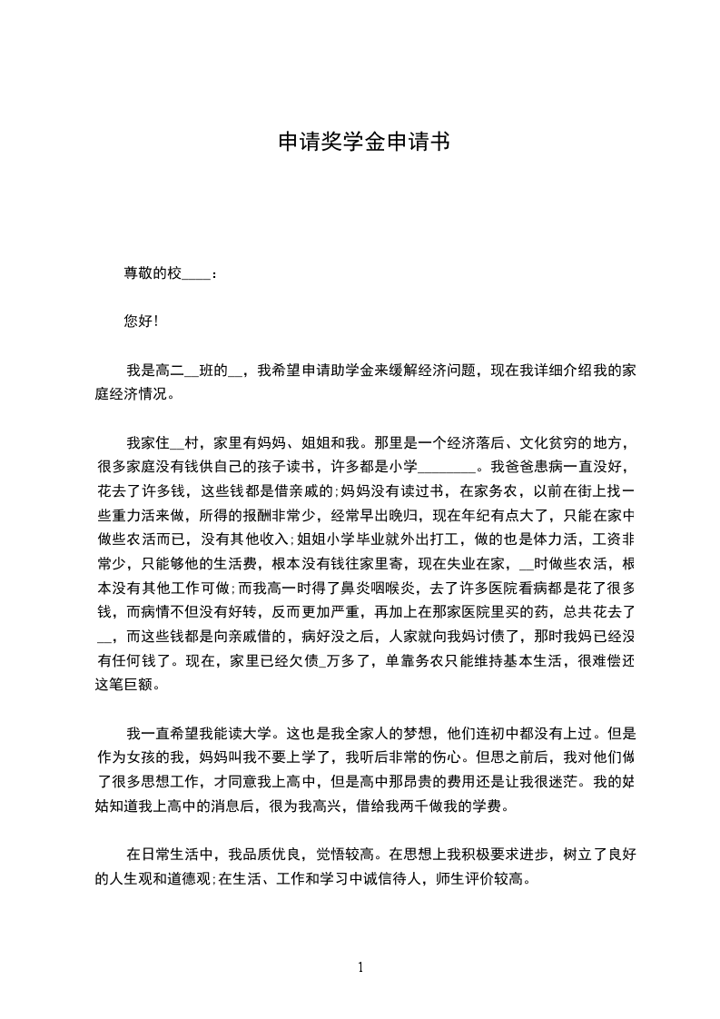 我是一名来自__县的一个小山村的学生,现就读于咱们__中学高三(1)班,综合自身实际情况,特向组织提出“优秀学生助学金”的申请,肯请学校可以核对并给予批准。