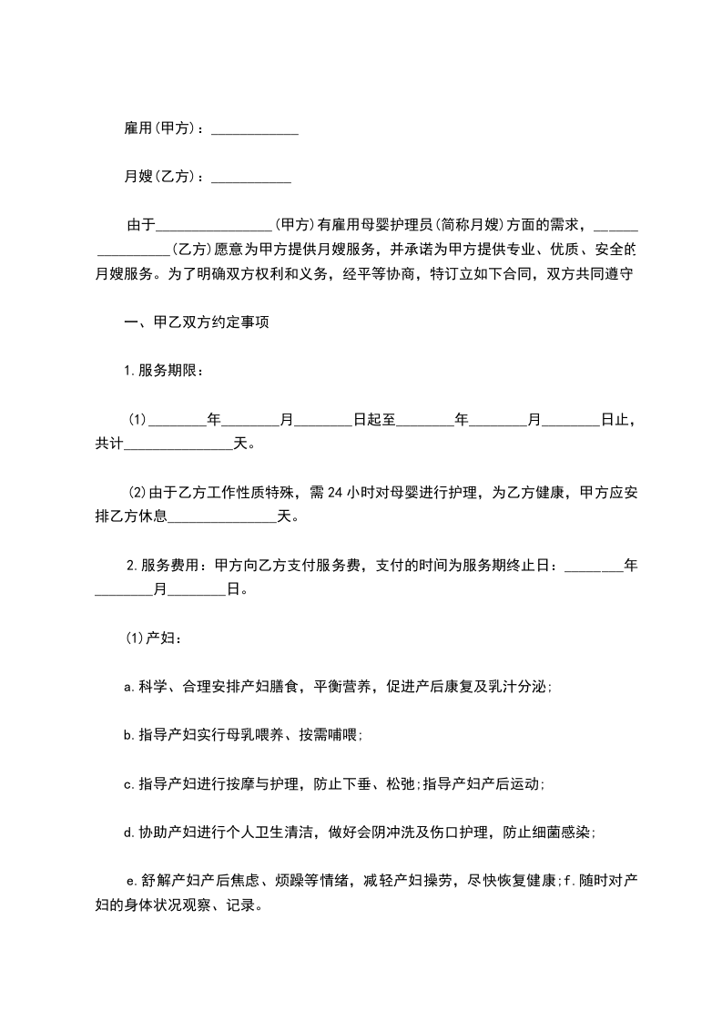 由于________________(甲方)有雇用母婴护理员(简称月嫂)方面的需求,________________(乙方)愿意为甲方提供月嫂服务,并承诺为甲方提供专业、优质、安全的月嫂服务。为了明确双方权利和义务,经平等协商,特订立如下合同,双方共同遵守: