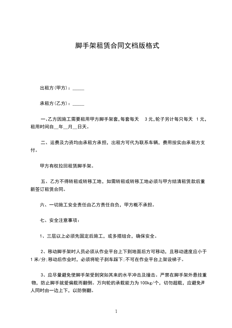 3、脚手架的延期使用费单价计算:合同约定单价租赁时间为30天,超过30天按每天________元/平方米计算。如租赁时间超期7天内不予计费。