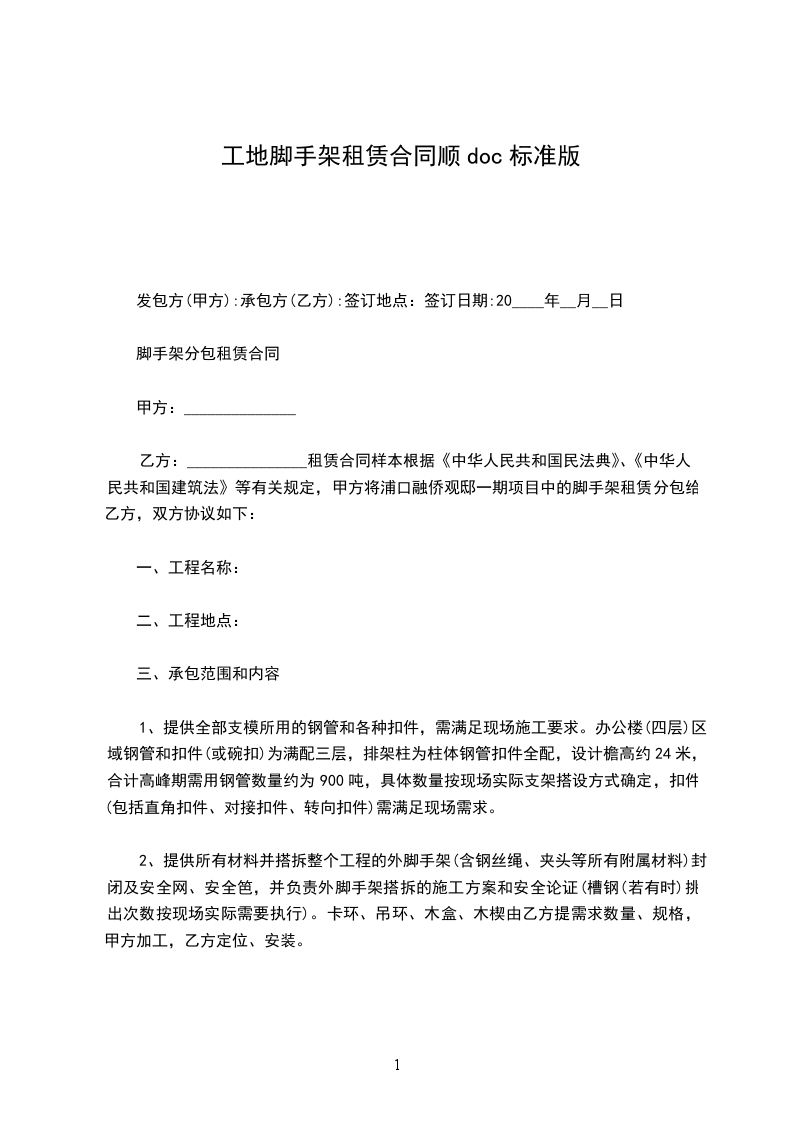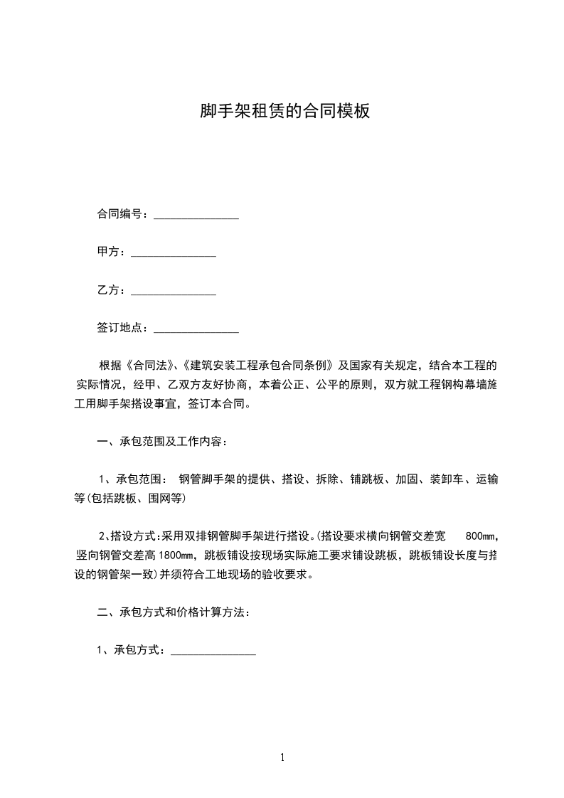 1、承包范围: 钢管脚手架的提供、搭设、拆除、铺跳板、加固、装卸车、运输等(包括跳板、围网等)