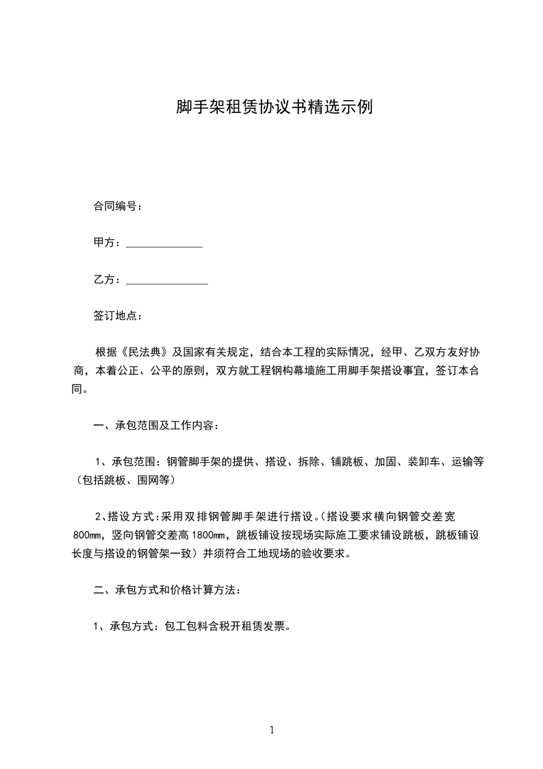 根据《民法典》、《建筑安装工程承包合同条例》及国家有关规定,结合本工程的实际情况,经甲、乙双方友好协商,本着公正、公平的原则,双方就工程钢构幕墙施工用脚手架搭设事宜,签订本合同。