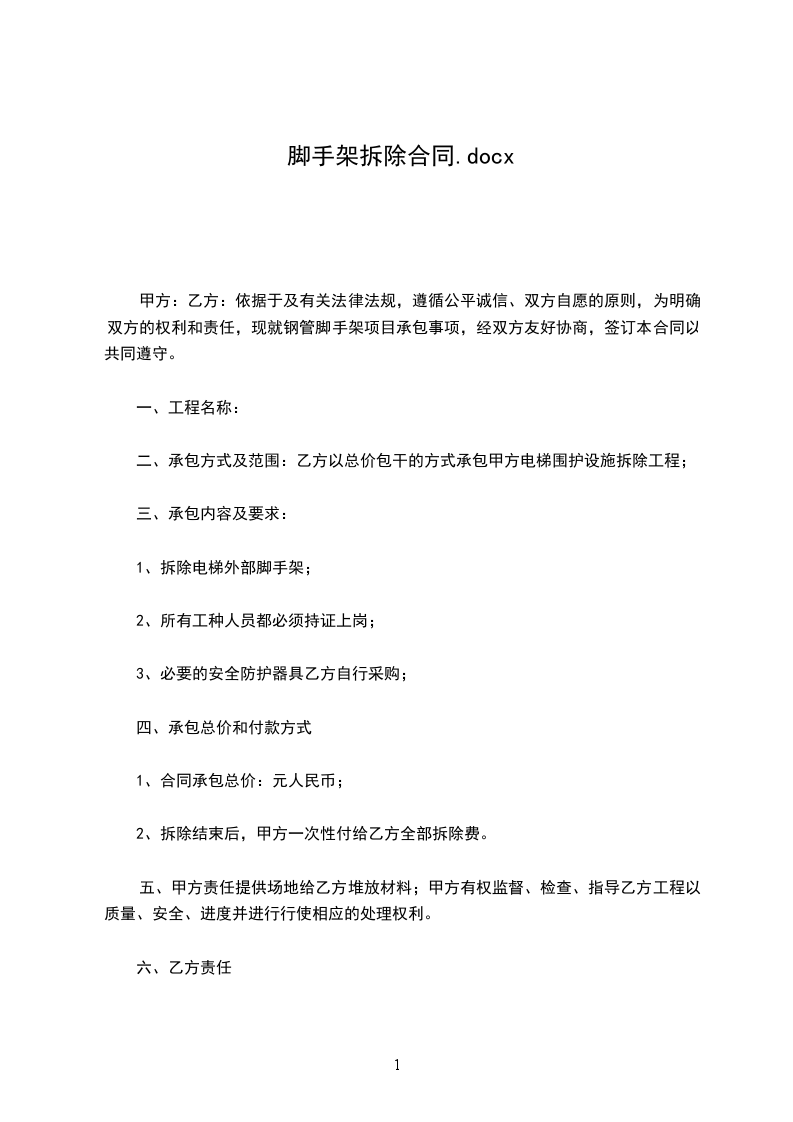 (9)甲方施工完毕,乙方应在接到通知后依据甲方提供的订单要求将脚手架拆除、运走,并负责将乙方因施工产生的垃圾(乙方架子材料垃圾)清理出场,保持施工现场清洁。