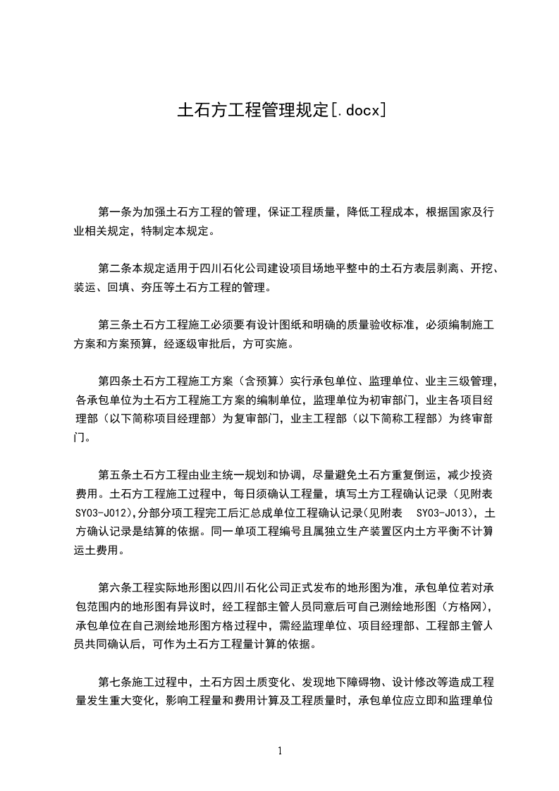 第一条为加强土石方工程的管理,保证工程质量,降低工程成本,根据国家及行业相关规定,特制定本规定。