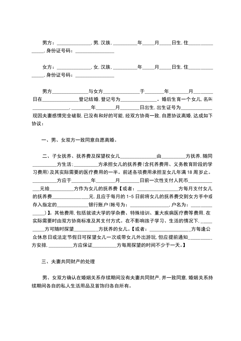 男方_______________与女方_______________于________年________月________日在_______________登记结婚,登记号为_______________。婚后生育一个女儿,名叫_______________,________年________月________日出生,出生证号为_____________。现因夫妻感情完全破裂,已没有和好的可能,经双方协商一致,自愿协议离婚,达成如下协议: