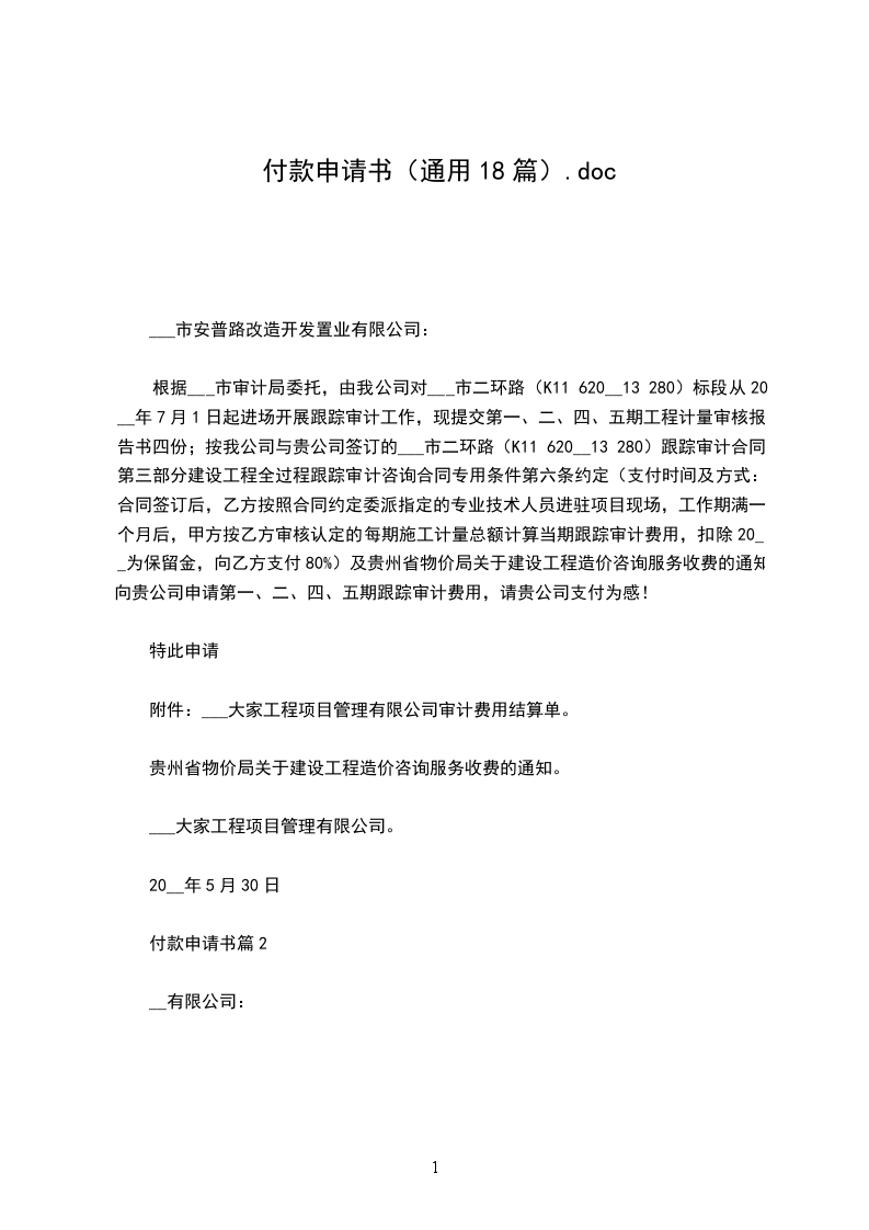根据xxx市审计局委托,由我公司对xxx市二环路(K11+620-K13+280)标段从________年____月____日起进场开展跟踪审计工作,现提交第一、二、四、五期工程计量审核报告书四份;按我公司与贵公司签订的xxx市二环路(K11+620-K13+280)跟踪审计合同第三部分建设工程全过程跟踪审计咨询合同专用条件第六条约定(支付时间及方式:合同签订后,乙方按照合同约定委派指定的专业技术人员进驻项目现场,工作期满一个月后,甲方按乙方审核认定的每期施工计量总额计算当期跟踪审计费用,扣除20%作为保留金,向乙方支付80%)及贵州省物价局关于建设工程造价咨询服务收费的通知向贵公司申请第一、二、四、五期跟踪审计费用,请贵公司支付为感!