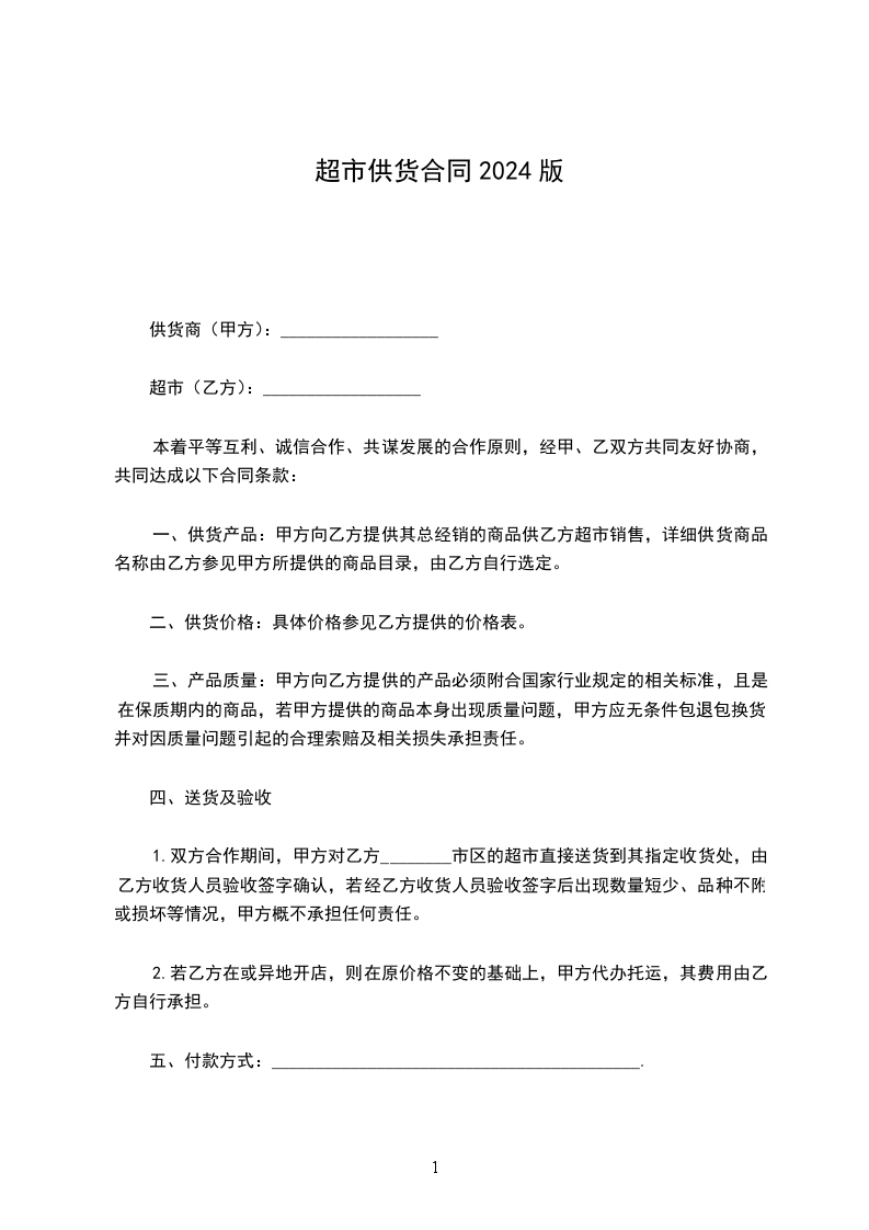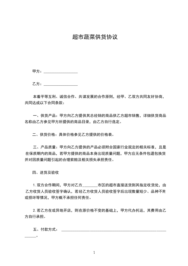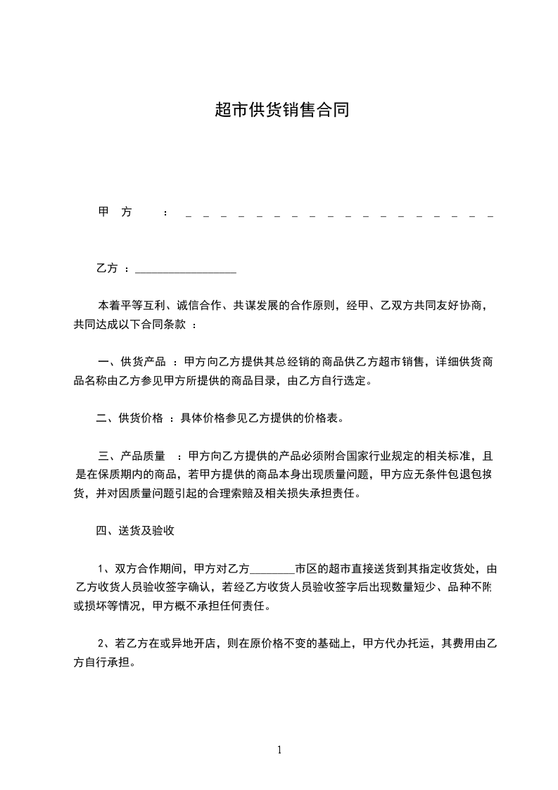 1.双方合作期间,甲方对乙方________市区的超市直接送货到其指定收货处,由乙方收货人员验收签字确认,若经乙方收货人员验收签字后出现数量短少、品种不附或损坏等情况,甲方概不承担任何责任。
