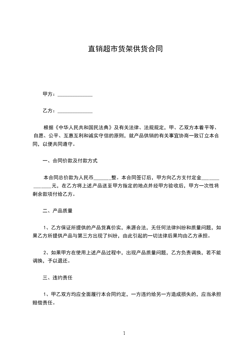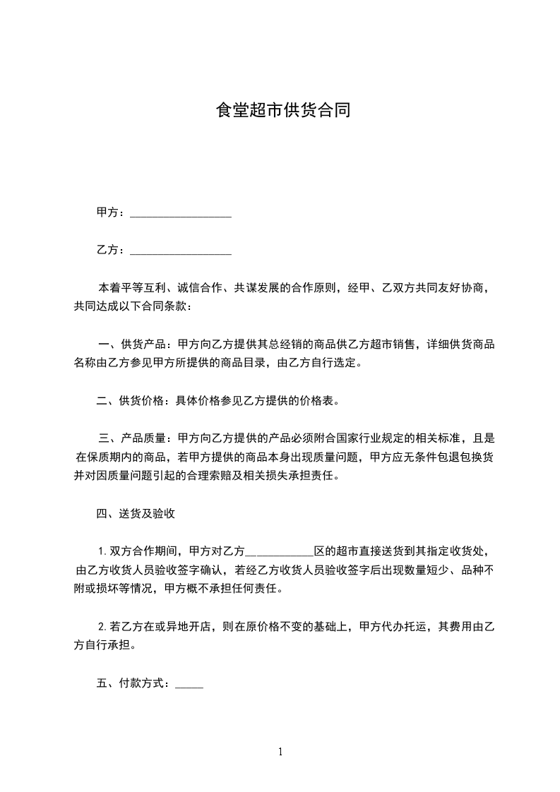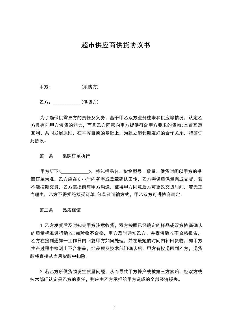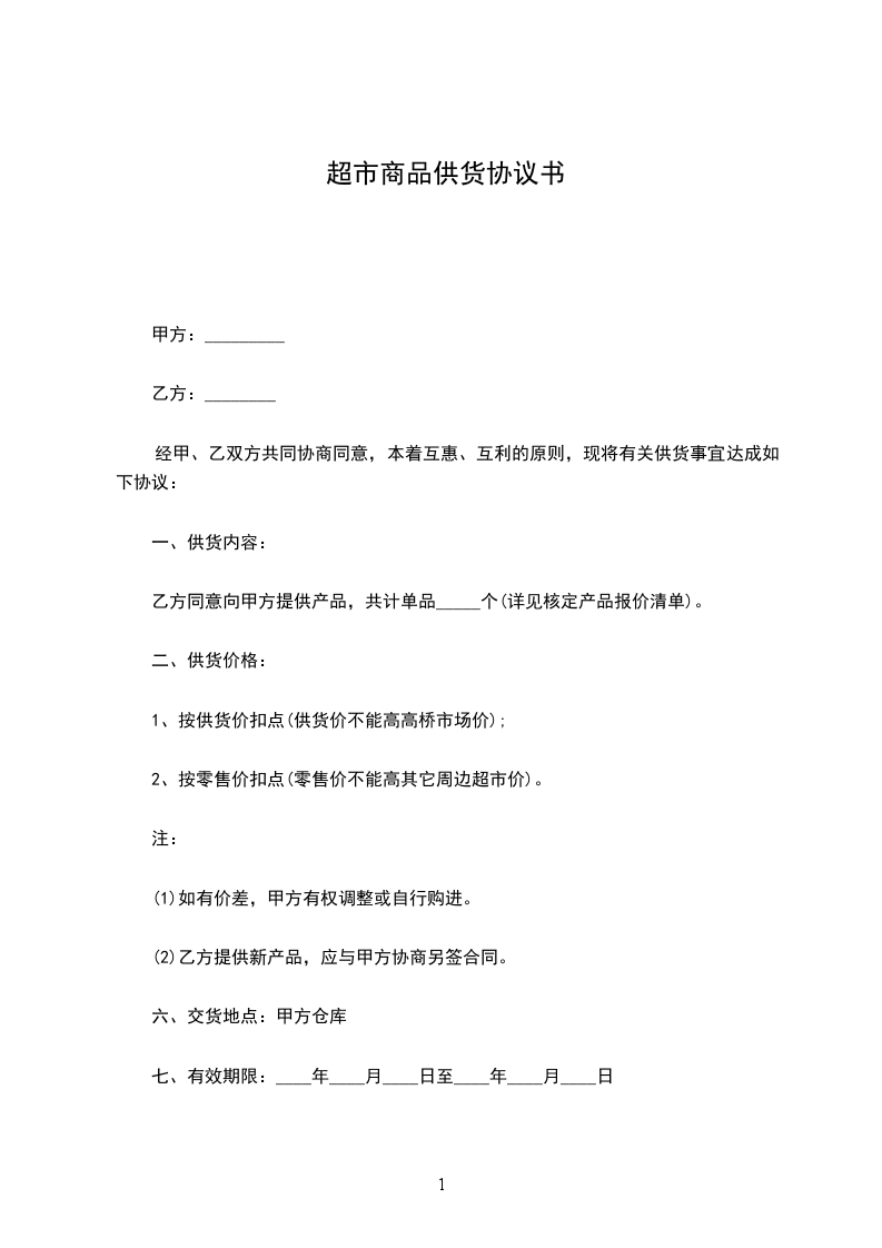 一、供货产品:甲方向乙方提供其总经销的商品供乙方超市销售,详细供货商品名称由乙方参见甲方所提供的商品目录,由乙方自行选定。