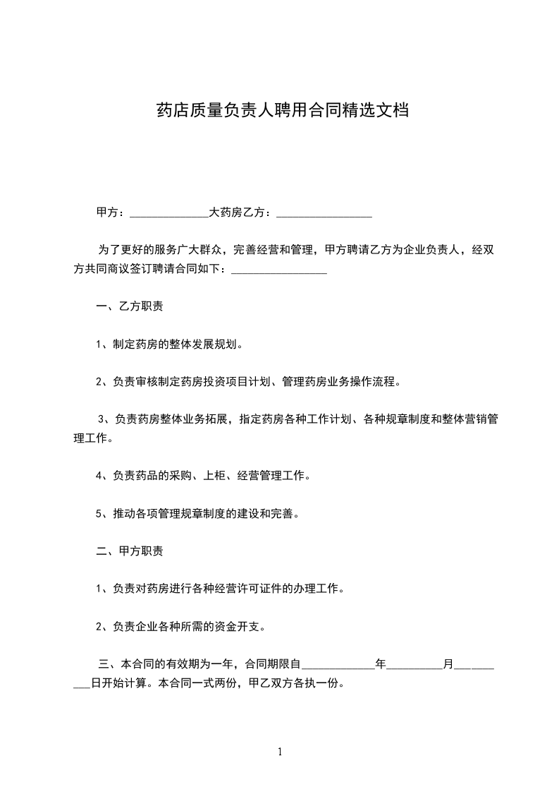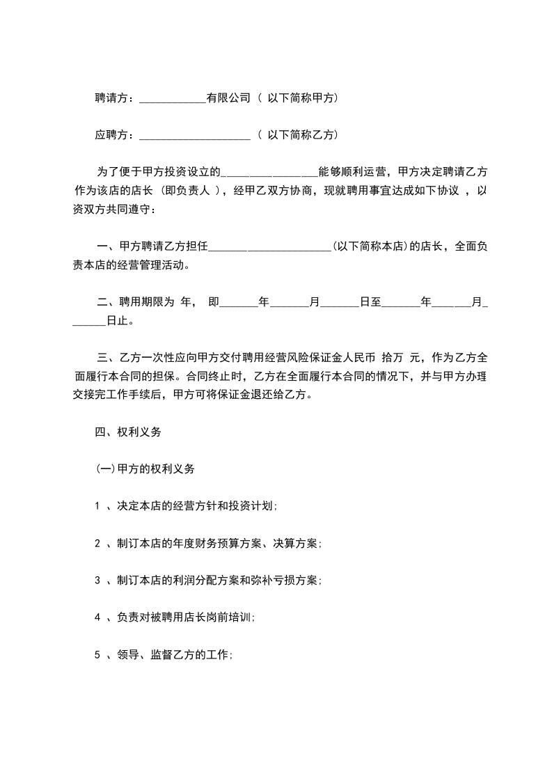 一、甲方聘请乙方担任______________________(以下简称本店)的店长,全面负责本店的经营管理活动。