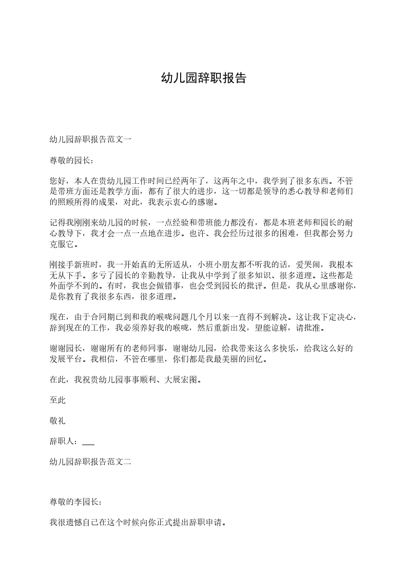 幼儿园辞职报告范文二尊敬的李园长: