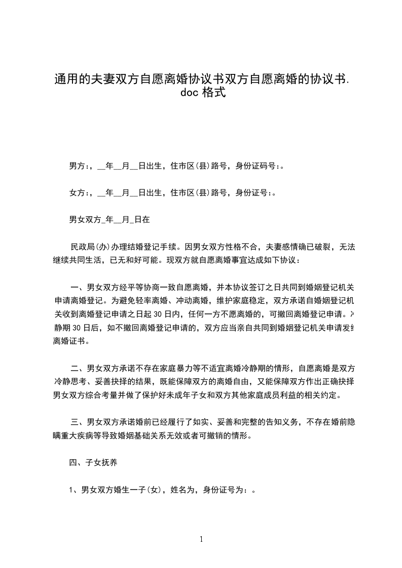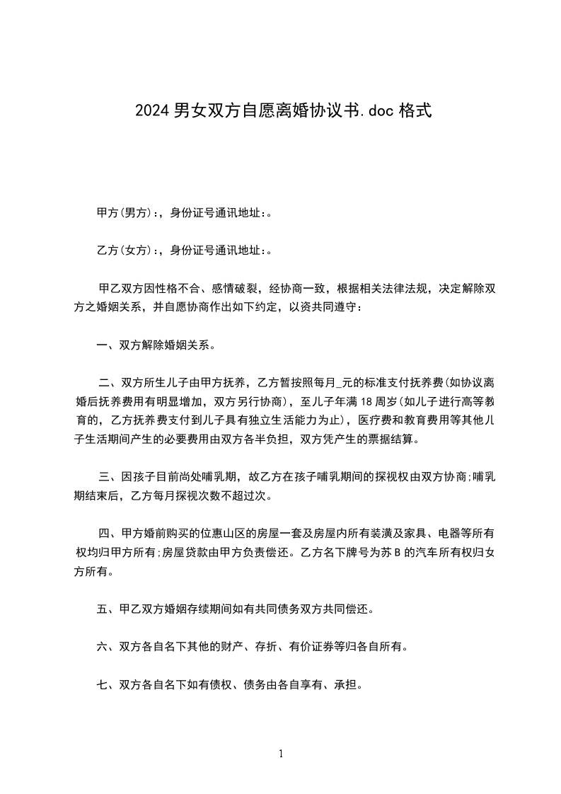 乙方(女方)姓名:性别:身份证号码: