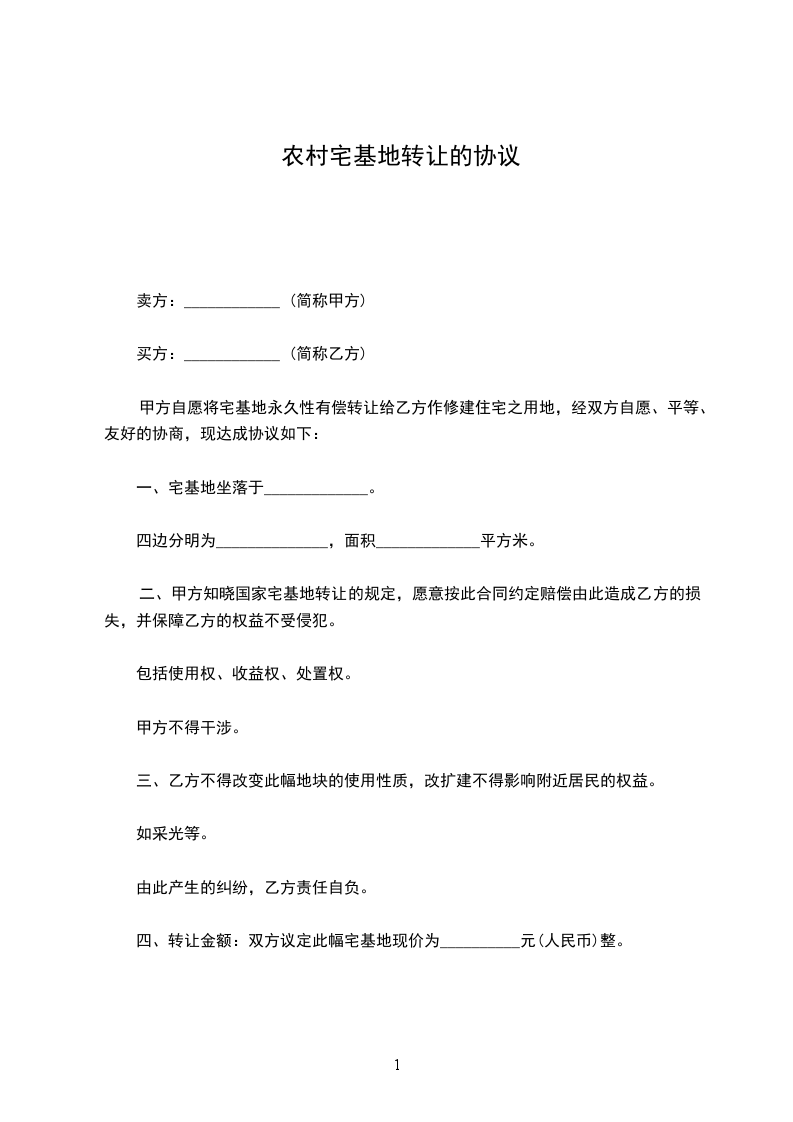 四、转让金额:双方议定此幅宅基地现价为__________元(人民币)整。