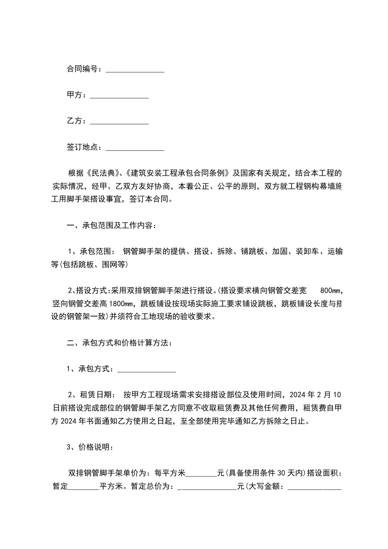 根据《民法典》、《建筑安装工程承包合同条例》及国家有关规定,结合本工程的实际情况,经甲、乙双方友好协商,本着公正、公平的原则,双方就工程钢构幕墙施工用脚手架搭设事宜,签订本合同。