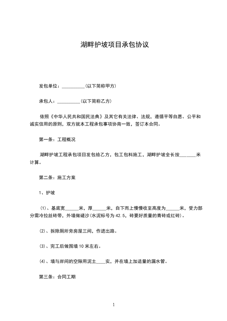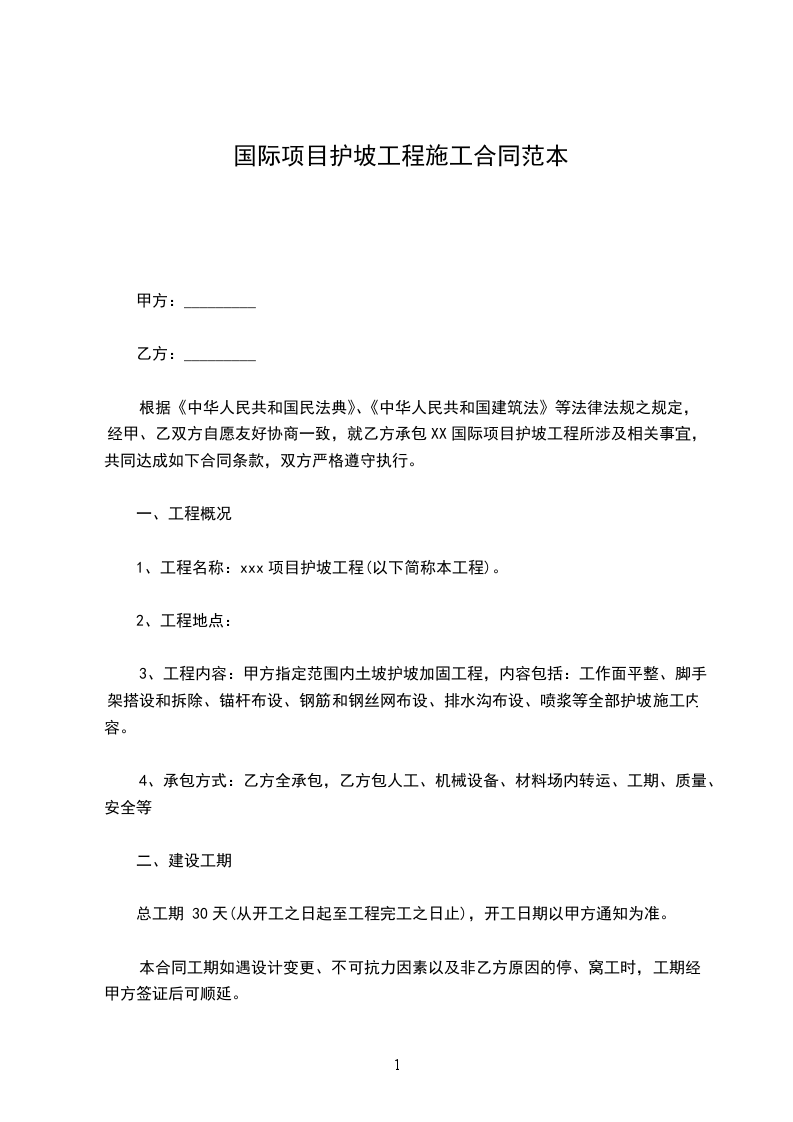 根据《中华人民共和国民法典》、《中华人民共和国建筑法》等法律法规之规定,经甲、乙双方自愿友好协商一致,就乙方承包XX国际项目护坡工程所涉及相关事宜,共同达成如下合同条款,双方严格遵守执行。