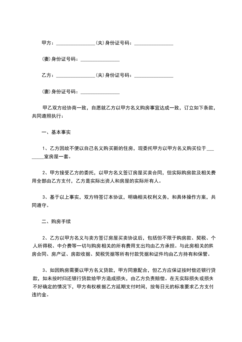 甲、乙双方经协商就甲方以乙方名义购房等事宜达成一致,特订立如下条款,以兹共同遵照执行: