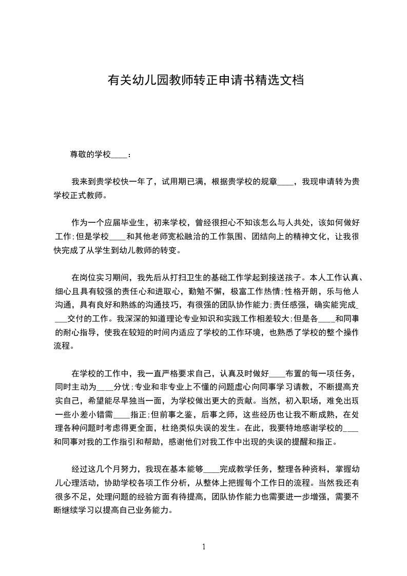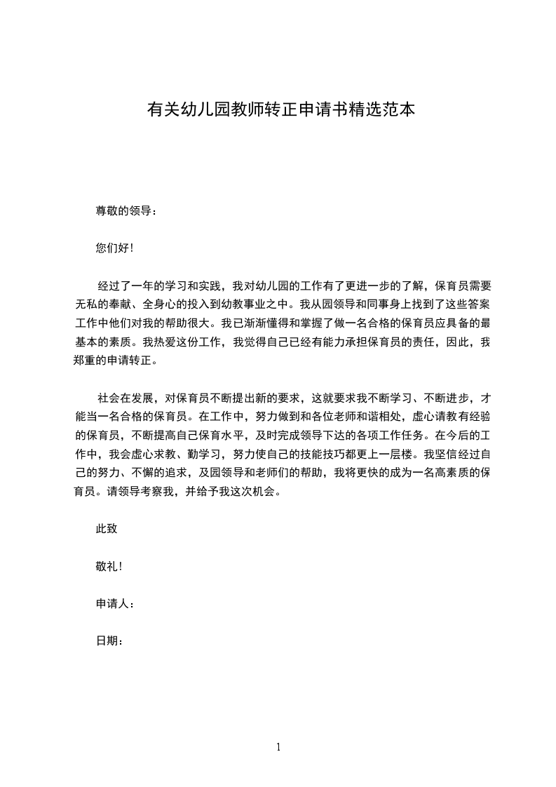 经过了一年的学习和实践,我对幼儿园的工作有了更进一步的了解,保育员需要无私的奉献、全身心的投入到幼教事业之中。我从园领导和同事身上找到了这些答案,工作中他们对我的帮助很大。我已渐渐懂得和掌握了做一名合格的保育员应具备的最基本的素质。我热爱这份工作,我觉得自己已经有能力承担保育员的责任,因此,我郑重的申请转正。