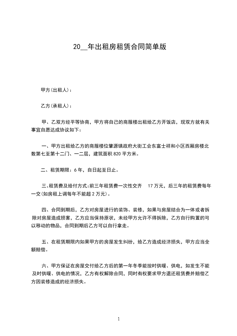 三、租赁费及给付方式:前三年租赁费一次性交齐17万元,后三年的租赁费每年一交(如房租上调每年不能超2万元)。