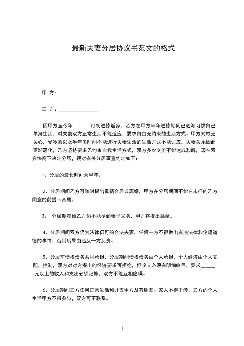 6、分居期间乙方任何正常生活和开支甲方及其朋友、家人不得干涉,乙方的个人生活甲方不得参与,双方可不联系。