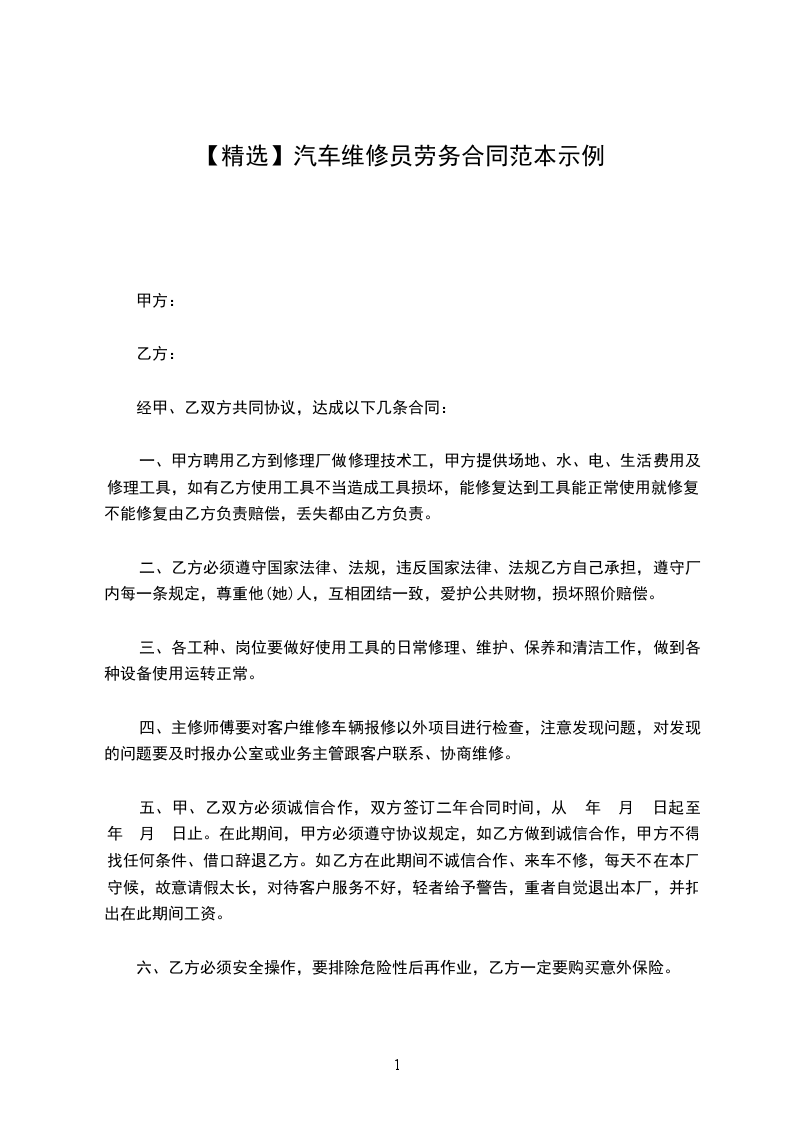 五、甲、乙双方必须诚信合作,双方签订二年合同时间,从 年 月 日起至 年 月 日止。在此期间,甲方必须遵守协议规定,如乙方做到诚信合作,甲方不得找任何条件、借口辞退乙方。如乙方在此期间不诚信合作、来车不修,每天不在本厂守候,故意请假太长,对待客户服务不好,轻者给予警告,重者自觉退出本厂,并扣出在此期间工资。
